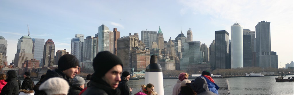 Nachdem wir also am Tag unserer Ankunft bereits um neun Uhr eingeschlafen waren, waren wir heute jetlagbedingt bereits um halb sechs hellwach. Dies führte dazu, dass wir bereits gegen sieben Uhr nach einem gesunden Pizzafrühstück (Reste!!!) unser Hotel in Richtung Central Park verließen. Zu diesem Zeitpunkt (und da es Samstag war), hielten isch dort lediglich einige Hundehalter auf, wir hatten den CentralPark also für uns. Nachdem wir einige Meter im noch sehr kargen und sehr großen Park gelaufen waren, setzen wir uns in die Metro, um zunächst zur Penn Station zu fahren. Kaum aus der Ubahnstation herausgekommen, standen wir vor dem Madison Square Garden, und mit Taxi und Polizeiautoaufkommen wurde uns dann auch wirklich klar, dass wir in New York sind! Schnell ein paar Fotos geschossen, ging es dann weiter zum Battery Park, von dem die Fähren zur Statue of Liberty und Ellis Island ablegen.