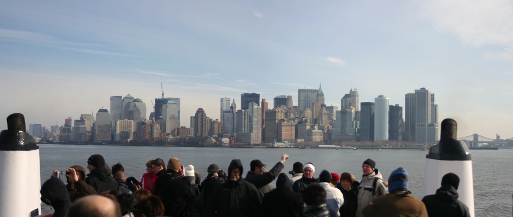 Zunächst war aber weniger der Anblick der Statue interesant, als die sich immer besser abzeichnende Skyline von Manhattan. Da ist das ganze Boot fototechnisch erstmal eskaliert. Marcus schwang sich auch gleich heldenhaft auf die Bank um die besten Fotos zu machen, wobei er auch mit Erfolg einige sehr schöne Aufnahmen machte.