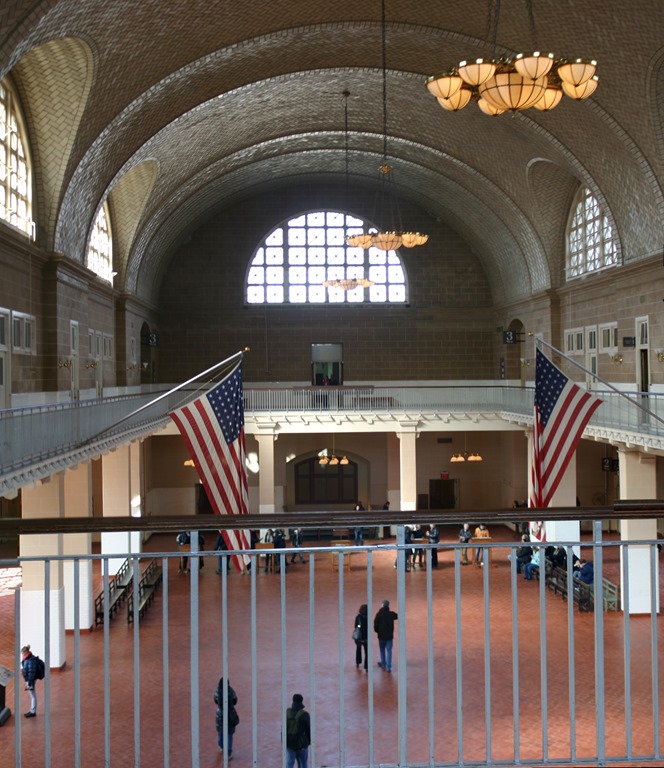 Mit der nächsten Fähre ging es dann nach Elli’s Island, oder besser wie im einführenden Film bezeichnet “Island of Hope, Islnad of Tears”. 16 Millionen Immigranten sind zwischen dem Ende des 19 Jahrhunderts und 1924 hier angekommen und zur Einwanderung “geprüft” worden. Zwar wurde nur ein geringer Teil wiederzurückgeschickt, doch die Massenabfertigung in medizinischer, juristischer und genereller Überprüfung hinterließ bei uns doch unangenehmere Erinnerungen. Das Museum in der ehemaligen Annahmehallte ist empfehlenswert, jedoch enttäuschenderweise kritisch völlig unreflektiert. Dass nach dem Peak 1907 die Einwanderungsbestimmungen besonders gegen bestimmte Länder oder politische Einstellungen stark beschränkt wurde in einem Land, dass für völlige Freiheit wirbt, wird nirgends erzählt. Schon sehr patriotisch das ganze. Da die Insel als National Park gilt, werden die Mitarbeiter als Ranger bezeichnet, eine Einstellungsvorraussetzung hierbei ist scheinbar, mindestens von einem Immigranten abzustammen, der auf Elli’s Island gelandet ist.