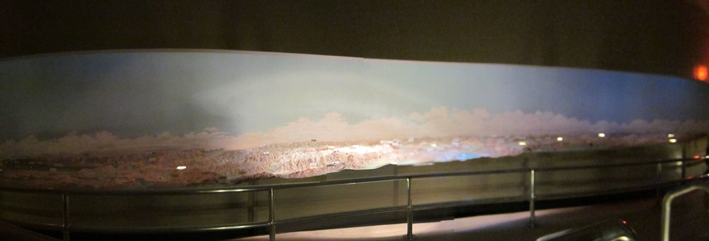Dann ging es auch schon wieder hoch und aus dem Visitors-Center raus. Als Insider-Tipp hat uns Frank mitgegeben, im alten Exhibition-Center vorbeizuschauen, was wir dann auch gemacht haben. Dort gab es ein Modell der Landschaft in den Staaten Utah, California, Nevada, Arizona und noch irgend einer. Mithilfe einer Licht-und-Stimme-Show, die bestimmt noch aus den Anfangszeiten des Hoover-Dams in den 1930er Jahren stammt (da begannen auch schon die Tours durch den Damm), wurde dann nochmals sehr begeistert darüber berichtet, was für Vorteile der Mensch dadurch hat, dass die vielen fleißigen Amerikaner damals in der Great Depression diesen revolutionären Damm gebaut haben. Interessant war es trotzdem, es gibt nämlich entlang des vom Hoover Dam angestauten Colorado River mindestens mal 10 weitere Dämme. Krass.