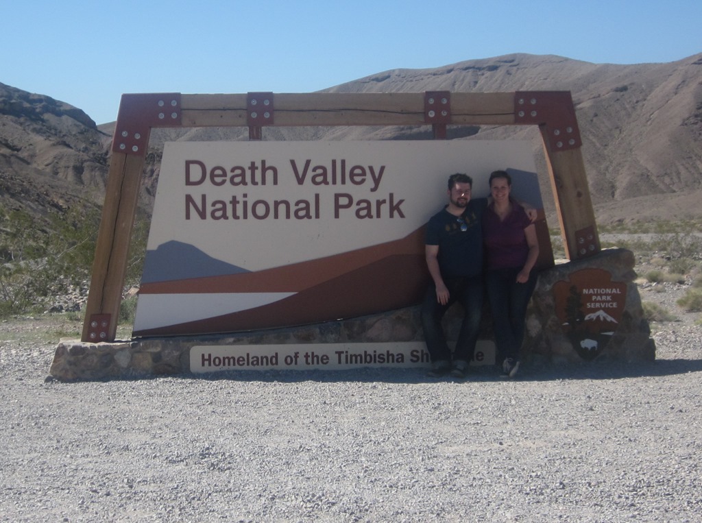 Am Eingang zum Nationalpark begrüßt uns dann auch gleich ein Schild, und es ist auch dort schon reichlich heiß. Doch es geht noch heißer, wie wir bald merken. Zunächst zahlen wir den obligatorischen Fee (am Automaten) und machen und auf den Weg zum Dante’s View, von dem man, immerhin über 1000m hoch gelegen, einen tollen Blick haben soll.