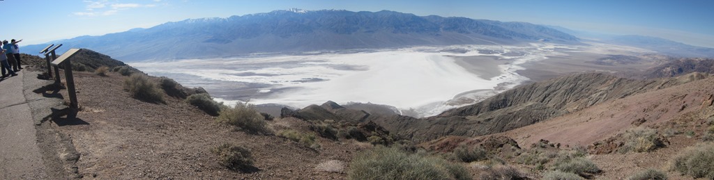 Die Straße zum besagten Ausblick ist irgendwann dann auch nur noch für Wagen unter 7m Länge befahrbar und eher marginal gesichert. Marcus hatte seinen Spaß beim Fahren Smiley. Der Ausblick hat sich dann aber wirkliuch gelohnt, insbesondere in das Badwater Basin, in dem eine Salzwüste einen adretten weißen Schimmer hinterlässt. Besonders interessant ist, dass der tiefste Punkt dort ganze 86m (!!!) unter dem Meeresspiegel liegt. Das ist übrigens auch der tiefste Punkt der USA.