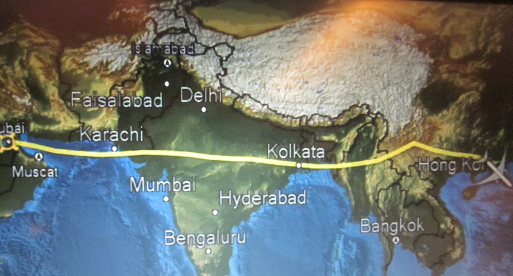 Auch dieses mal fühlten wir uns bei Emirates gut aufgehoben und konnten die Zeit dank der zur Verfügung stehenden Unterhaltungsauswahl ganz gut überbrücken. Mit zunehmender Näherung an Hong Kong machte sich dann bei mir Aufregung breit,- insbesondere über die Art, wie wir zu unseren Hostel (das Hong Kong Budget Hostel in Mong Kok) gelangen sollten und ob uns der Hostelbesitzer, welcher in vielen Berichten als unfreundlich beschriebe wurde, überhaupt aufnehmen würde. Wir hatten zwar eine Email geschrieben, dass wir nicht vor Mitternacht im Hostel sind, diese wurde jedoch lediglich mit “noted” beantwortet. Marcus allerdings hatte garkeine Bedenken. Nachdem wir am Flughafen von Hong Kong unser Gepäck aufgesammelt hatten, beriet uns sogleich eine nette Dame über die Möglichkeiten, vom Flughafen aus nach Mong Kok zu kommen, und schenkte uns sogleich diverse Infomaterialien und Stadtkarten.