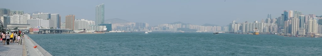 Nach einiger Zeit sind wir dann auch am Wasser angekommen. Endlich. Und belohnt wurden wir mit einem Ausblick wo uns kurzzeitig die Spucke wegblieb. Wir haben ja bereits die ein oder andere Skyline gesehen in unserem Leben, aber sowas gehörte noch nicht dazu. Auf dem Foto kommt das glaube ich noch garnicht ausreichend rüber. Ein spektakulärer Anblick auf jeden Fall. Dahinter dann die Berglandschaft, von der wir glauben, dass dort auch der Victoria Peak ist. Ein toller Moment auf jeden Fall.