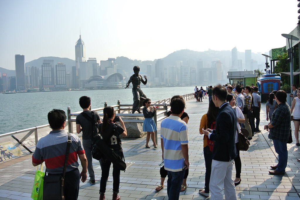 Dort am Pier gibt es übrigens auch eine Art von Walk of Fame,- die Avenue of Stars,- wo chinesiche Filmgrößen verewigt wurden. Wir kannten allerdings nur sehr wenige, unter anderem Jackie Chan. Bruce Lee wurde zudem noch mit einer Statue geehrt, um welche sich auch zahlreiche Asiaten tummelten.