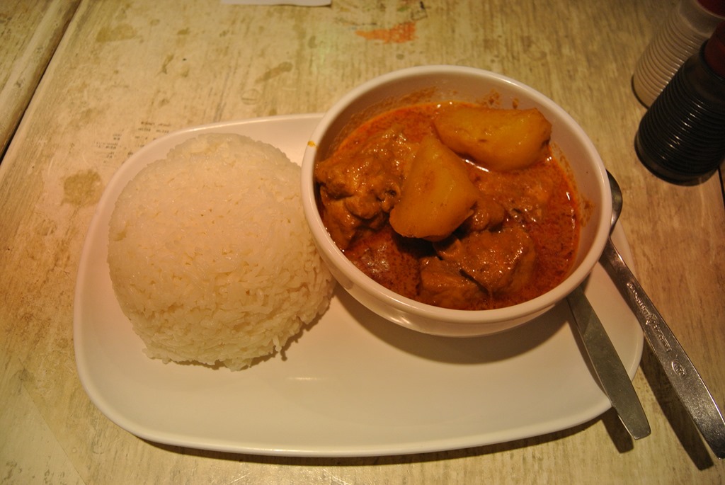 Damit hatten wir den Nachtisch eigentlich bereits vor dem Hauptgang genossen, denn unser Hunger wollte dann doch endlich gestillt werden, wir hatten heute noch garnichts warmes. Wir wollten uns langsam an das Essen hier herantasten und haben uns an die fleischlastigen Grille an den Straße nicht rangetraut. Stattdessen probierten wir es mit einem Chicken Curry.