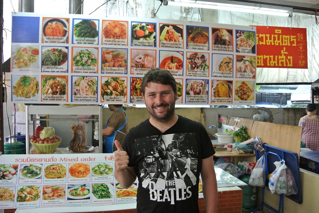 Ganz Bangkok ist derzeit in gelb und pink geschmückt, denn morgen ist der Geburtstag des Thailändischen Königs. Gelb ist wohl die Farbe des Königshauses (oder Gold?) und Pink steht für Gesundheit, wenn ich das richtig verstanden habe. Das Streetfood hier in Bangkok sieht deutlich Touristenfreundlicher aus, als beispielsweise in Ho Chi Minh City, finden wir jedenfalls. Meistens bleiben wir hier beim Streetfood auch Vegetarisch… sicher ist sicher… Es hat aber nichts geholfen, Conny haben die Nudeln dennoch auf den Magen geschlagen.