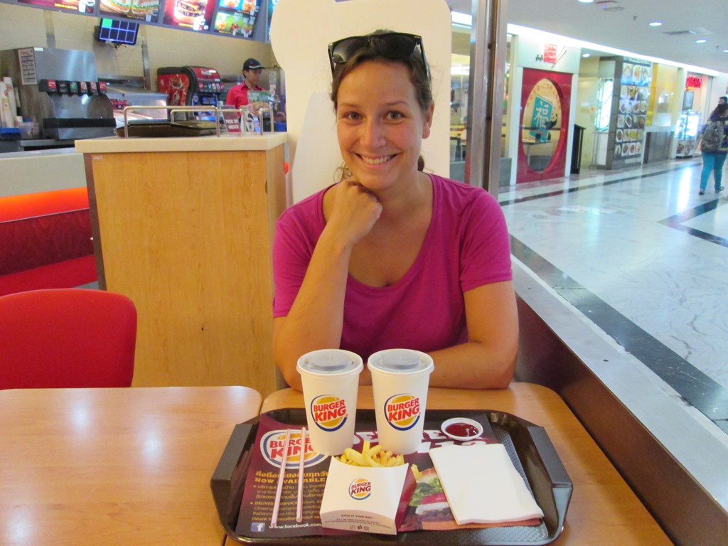 Heute sollen zwar wieder Proteste in Bangkok stattfinden – die hatten zum Königsgeburtstag pausiert – wir wollten dennoch ein bisschen was von den Innenstadt-Sehenswürdigkeiten sehen, die liegen aber alle nahe den demonstrierenden. Also erstmal schlau gemacht im Hostel und ein paar kann man sich wohl ungefährdet angucken. Okay. Also los gehts mit dem Skytrain, der fährt jedoch nur bis an den Rand der Innenstadt, ab da sind wir dann zu Fuß losgebummelt. Auch wieder durch einige Malls und auch ein paar Pommes und ne Cola bei BurgerKING waren mal drin. Das erste mal BurgerKING seit Shanghai. Das ist schon ein paar Wochen her.