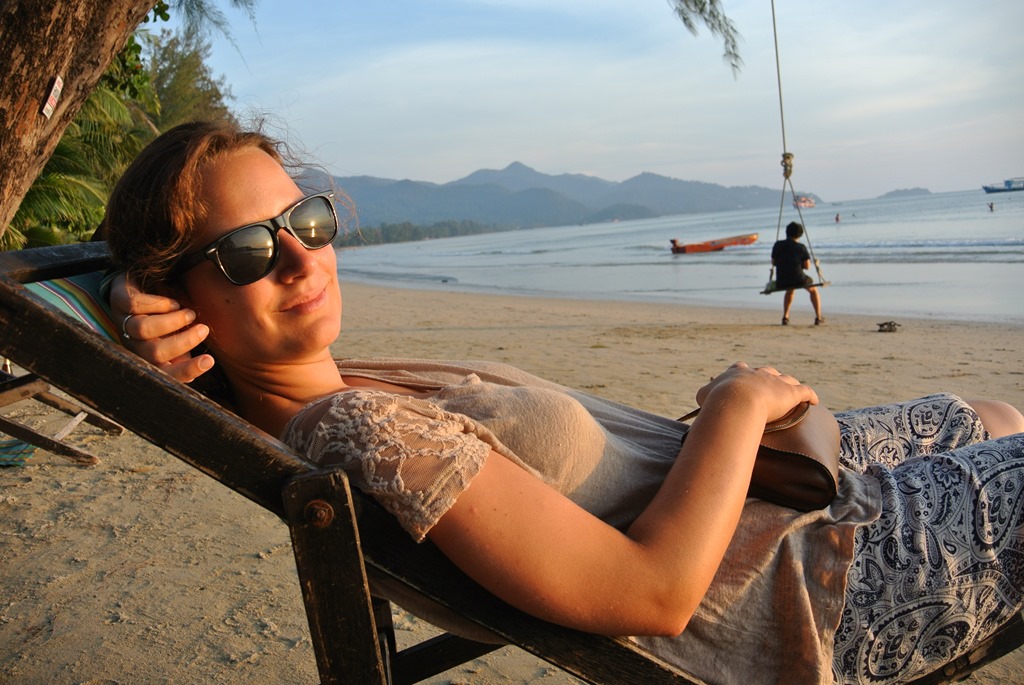 Also erstmal in einen Liegestuhl geschmissen und den Sonnenuntergang genossen…der mal wieder traumhaft war. Hoffentlich stumpfen wir nicht ab und finden nachher jeden Sonnenuntergang nur noch durchschnittlich. Strandschaukeln gab es dort auch, also durfte Conny ein bisschen Schaukeln und sich, fast so grazil wie die Raffaelofrau, als Motiv anbieten.
