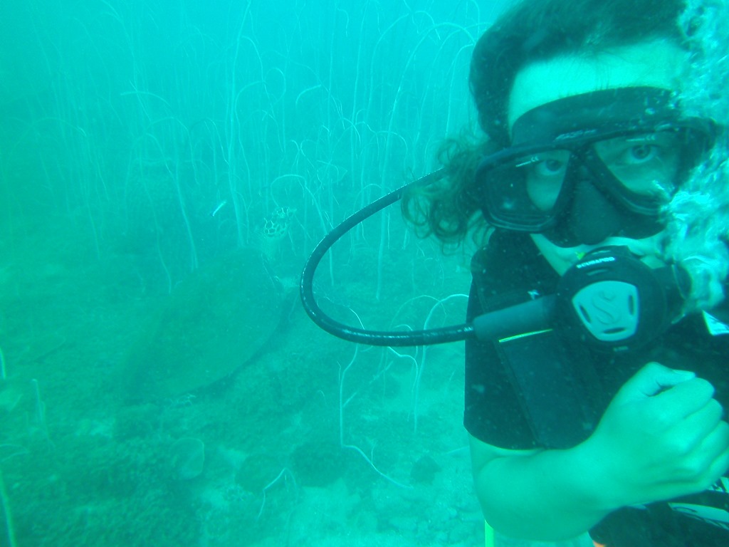 Nun was soll ich sagen, mein vierter Tauchgang war gelinde gesagt der Hammer. Die Übungen habe ich ein Glück gleich zu Anfang gemeistert und bin danach quasi nur noch getaucht und gleich zu Beginn haben wir eine Meeresschildkröte gefunden!!! Sie war riesig, bald 1m würde ich sagen und Patrick meinte, sie sei bestimmt schon über 70 Jahre alt. Majestätisch kraulte sie langsam durch die Korallen und war einfach nur wunderschön.