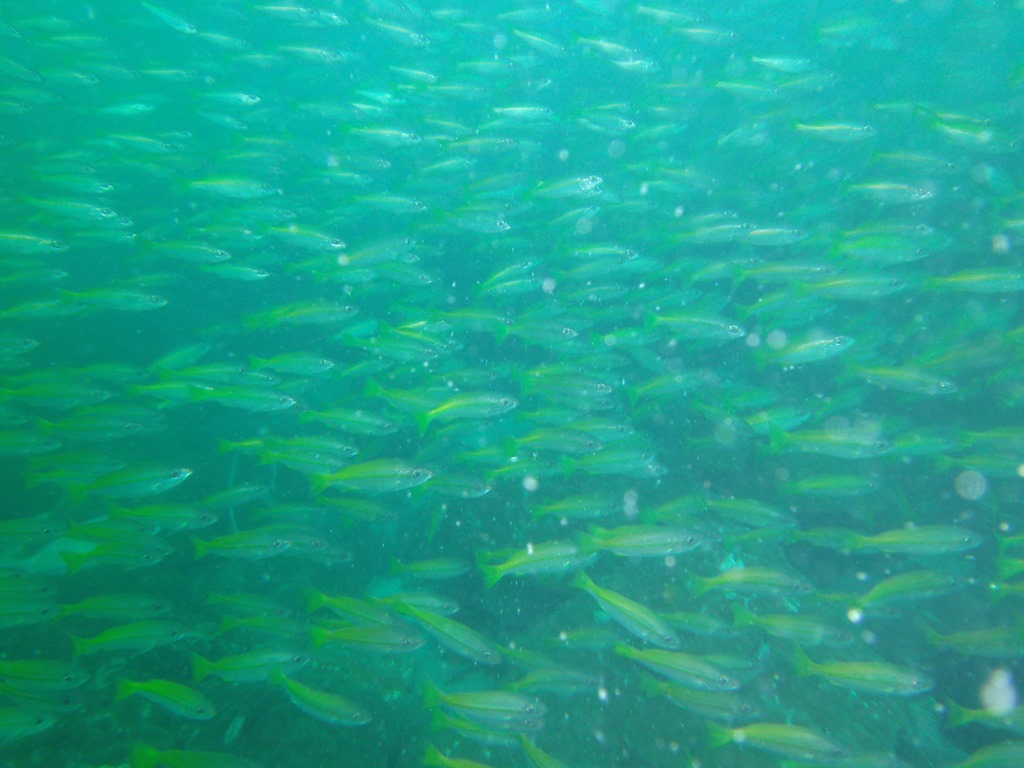 Wir hatten heute eigentlich keine Unterwasserkamera dabei, erst am dritten Tag. Da wir die Tauchstelle aber auch am Folgetag besucht haben, habe ich ein paar Bilder vom dritten Tag gemopst, um meine Eindrücke ein bisschen zu visualisieren. Es war nämlich überragend. Der Abstieg ging relativ langsam, aber als wir dann unten waren und ich den Kopf ein wenig gehoben habe, erstreckten sich vor mir so viele Fische und Seepflanzen, wie ich sie noch nie gesehen habe.
