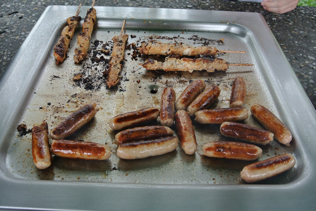 Bei uns gab es dann Würstchen und Chicken-Spieße, dazu Baguette, diverse Soßen und eben der Salat. Lecker war es, nur mussten wir mittendrin vor dem Monsun flüchten und im Stehen am überdachten Grill essen. Macht aber auch nichts.