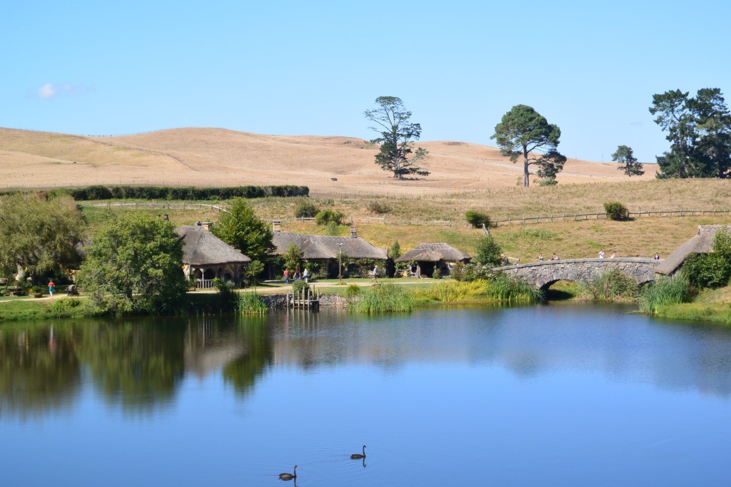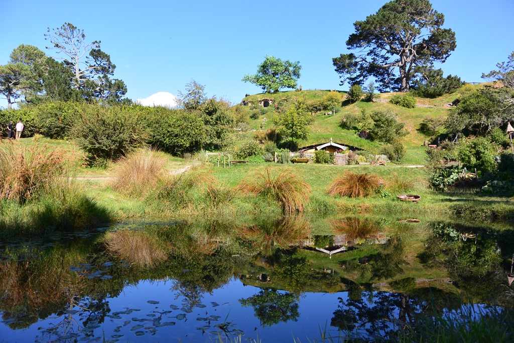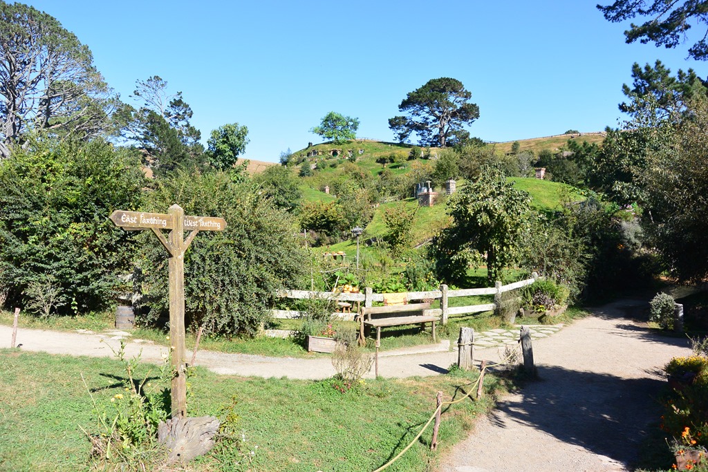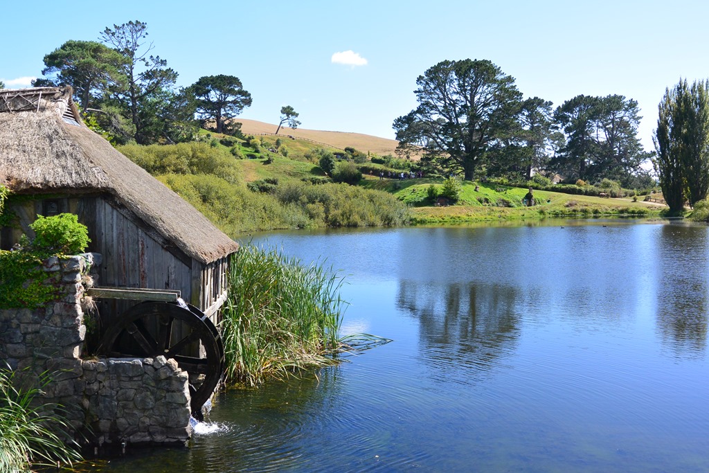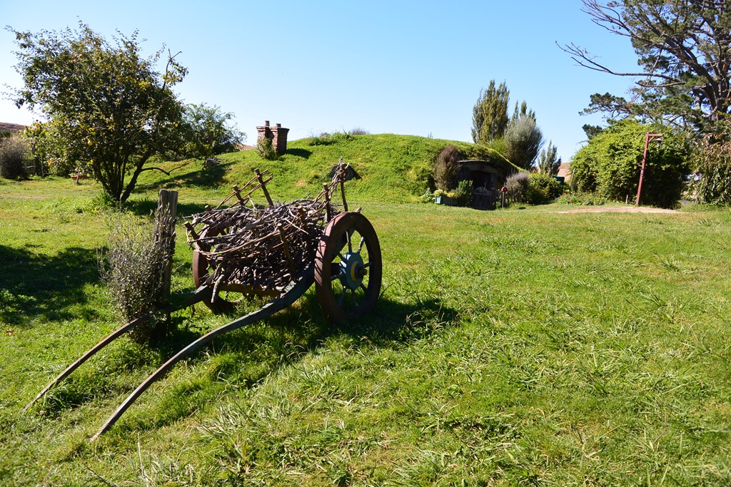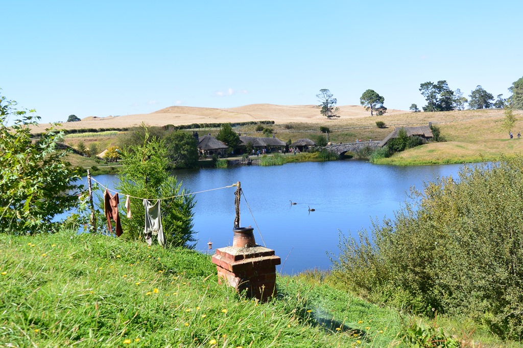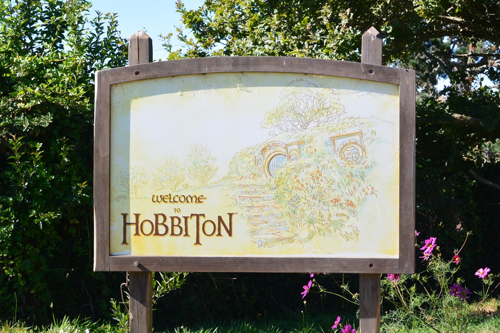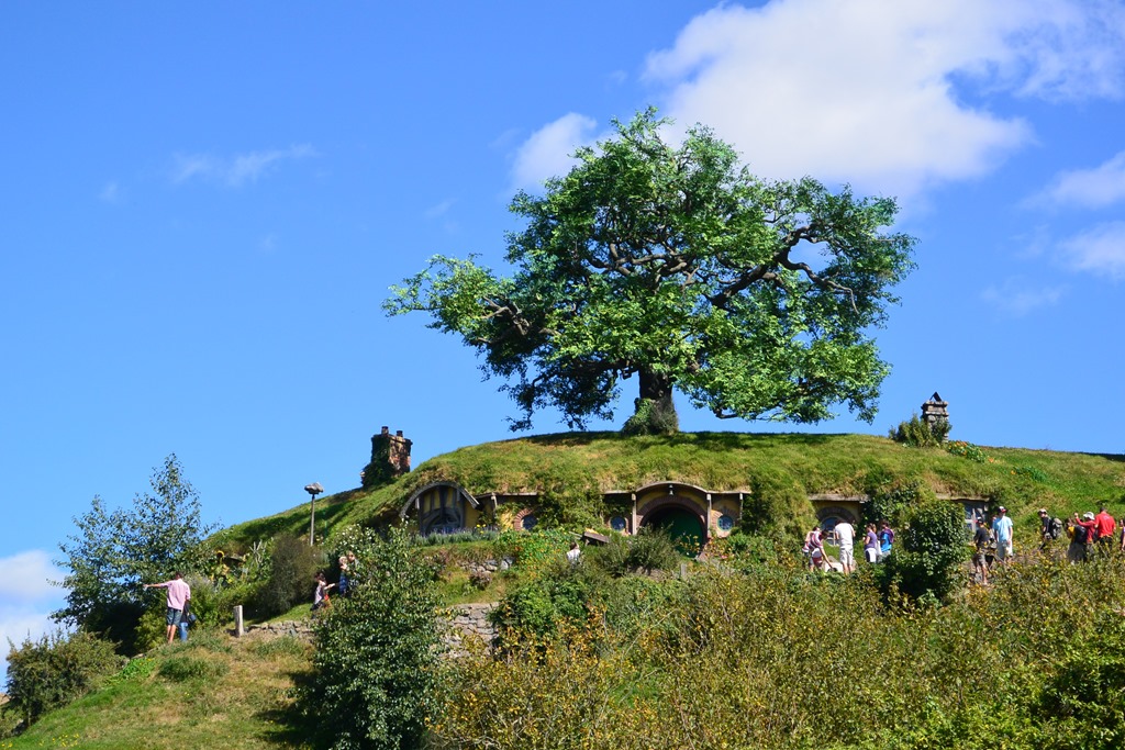 Nach wenigen Minuten wird uns klar: Es ist grün, was wohl an den 5 Vollzeitgärtnern liegt, die hier beschäftigt sind, wie uns unser Guide erklärt (ohne Führung kommt man leider nicht hin…). Wir betreten Hobbingen durch ein kleines Holztor, vorbei am Willkommenschild und gehen durch die gleiche Gasse, durch die Gandalf seinen Karren fährt,- und vor uns eröffnet sich ein toller Blick auf den “Hill”, den sagenumwogenen Hügel von Bilbo Beutin.