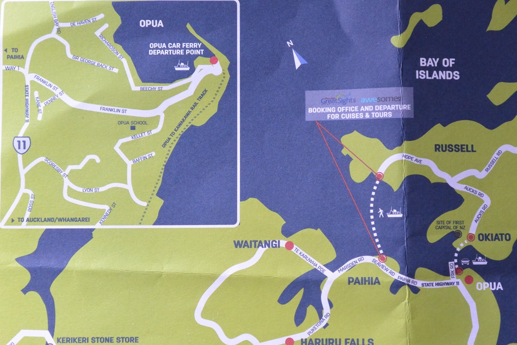 Der nächste Tag stand schon wieder im Zeichen unserer Abreise. Um 10 Uhr mussten wir unsere Cabin verlassen, der Bus fuhr aber erst um 16 Uhr ab. Verdammt. Also die Rucksäcke verstaut und nochmal zu den “Treaty Grounds” gelaufen. Das ist dort, wo damals Briten und Maori einen ersten gemeinsamen Vertrag unterschrieben haben. Auf der kleinen Map sind wir und der Treaty Ground übrigens in Waitangi, unser Bus fährt von Paihia ab.