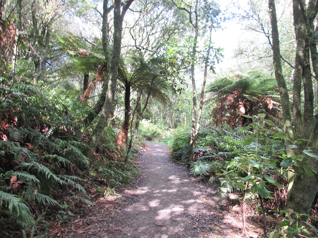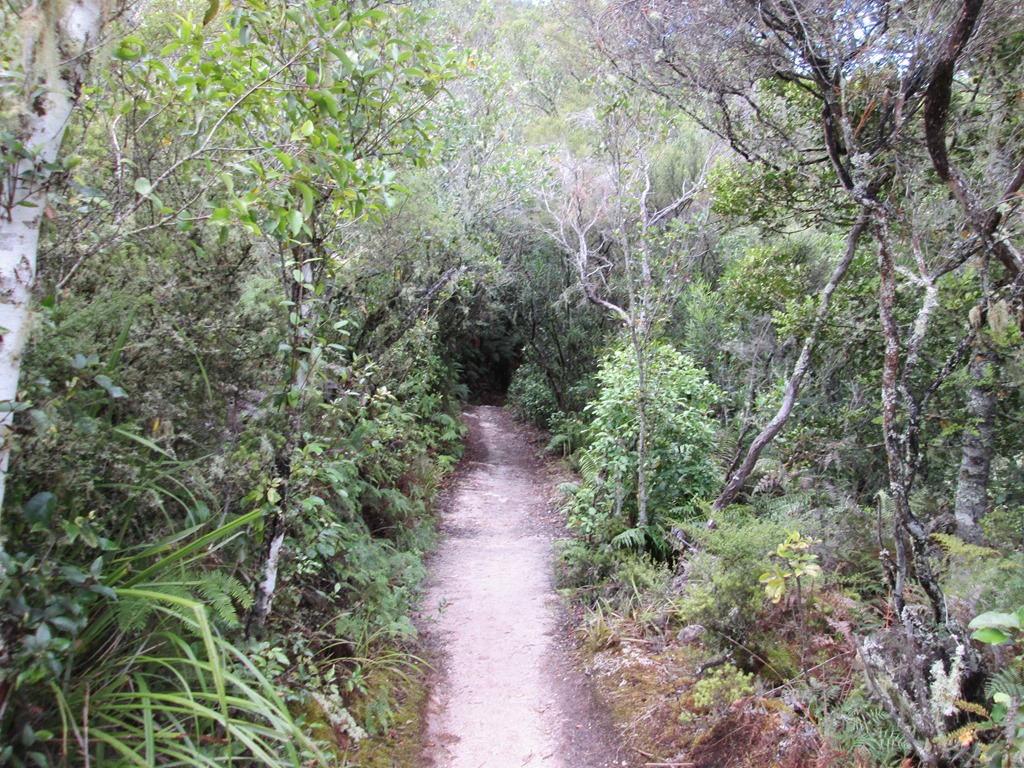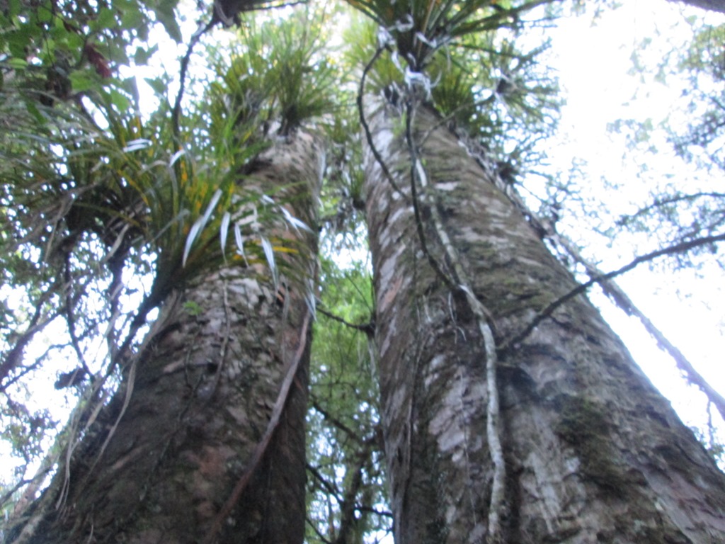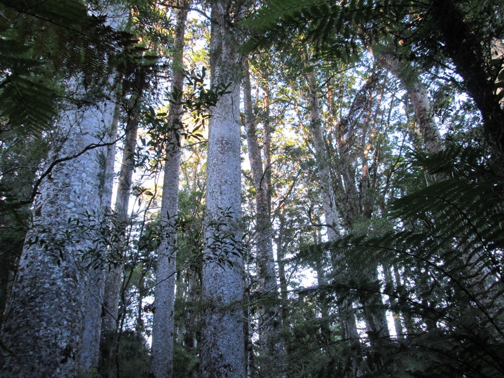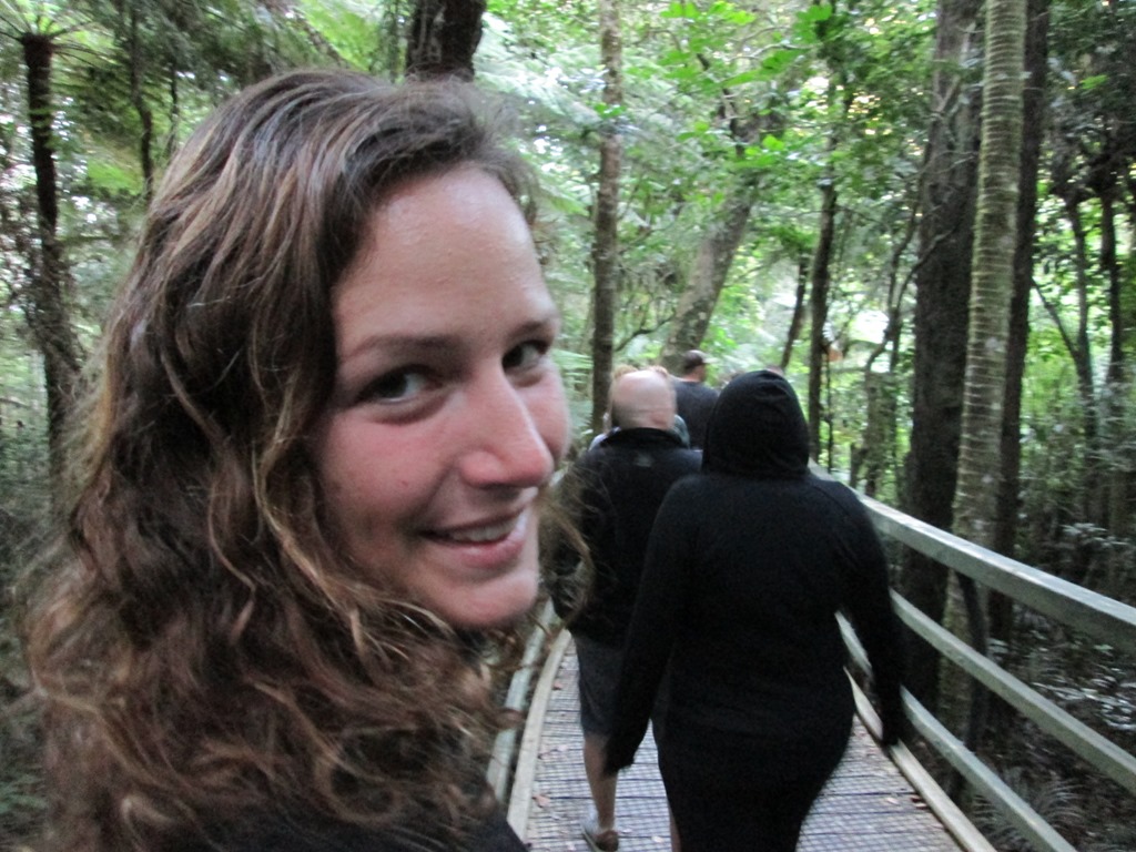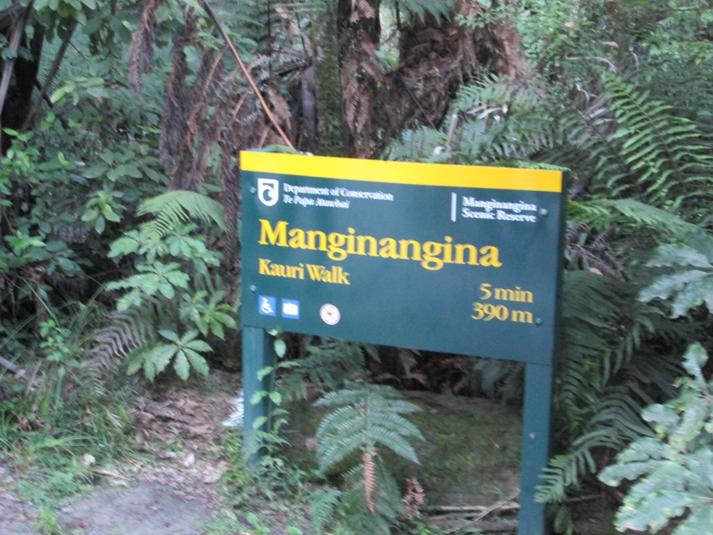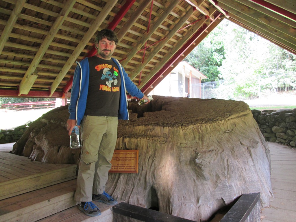 Der selbst für neuseeländische Verhältnisse viel zu entspannte Busfahrer hatte uns erst vergessen und kam dann nochmal zurück, um uns dann doch noch aufzusammeln, etwas über eine halbe Stunde nach Pickup-Zeit. Wir sind auf jeden Fall froh, dass er uns noch mitgenommen hat. Unser erster Stopp ist dann ein kleiner Rundgang, nämlich der Manginangina Walk. Der wurde damals für viel Geld für die Queen gebaut und ist über 300m lang, die Queen hat aber wohl leider nur 10m davon begutachtet und ist dann wieder abgedampft. Tse. Also rauf auf den teuren Rundgang, der uns die lokale Vegetation näher bringen soll. Darunter natürlich auch wieder die großen “Kauri”-Bäume.