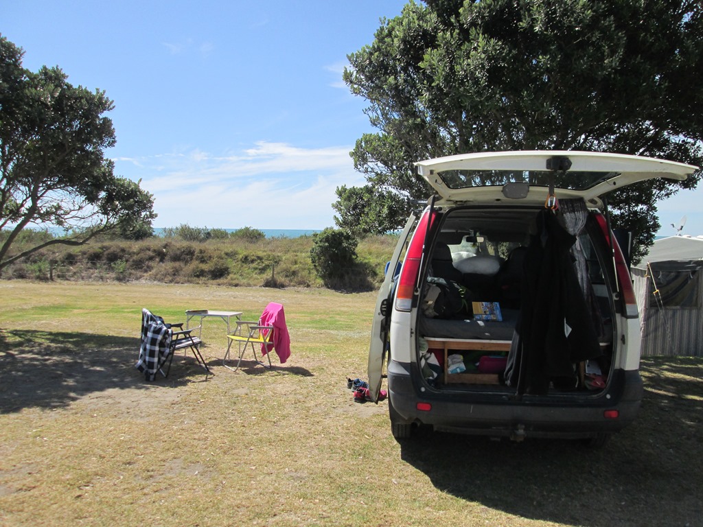 Nach unserer Hobbiton-Tour haben wir uns direkt in den Camper geschwungen und sind losgefahren, denn wir wollten heute noch bis zur Küste kommen. Dort gibt es einen schönen und günstigen Campingplatz direkt am Meer, den wir für die zweite Nacht im Camper ansteuern wollten. Das haben wir dann auch fix geschafft, die Distanzen in Neuseeland sind immer angenehm kurz und so kommen wir 2 Stunden später an und bekommen auch noch einen tollen Stellplatz mit Meeresrauschen und allem!