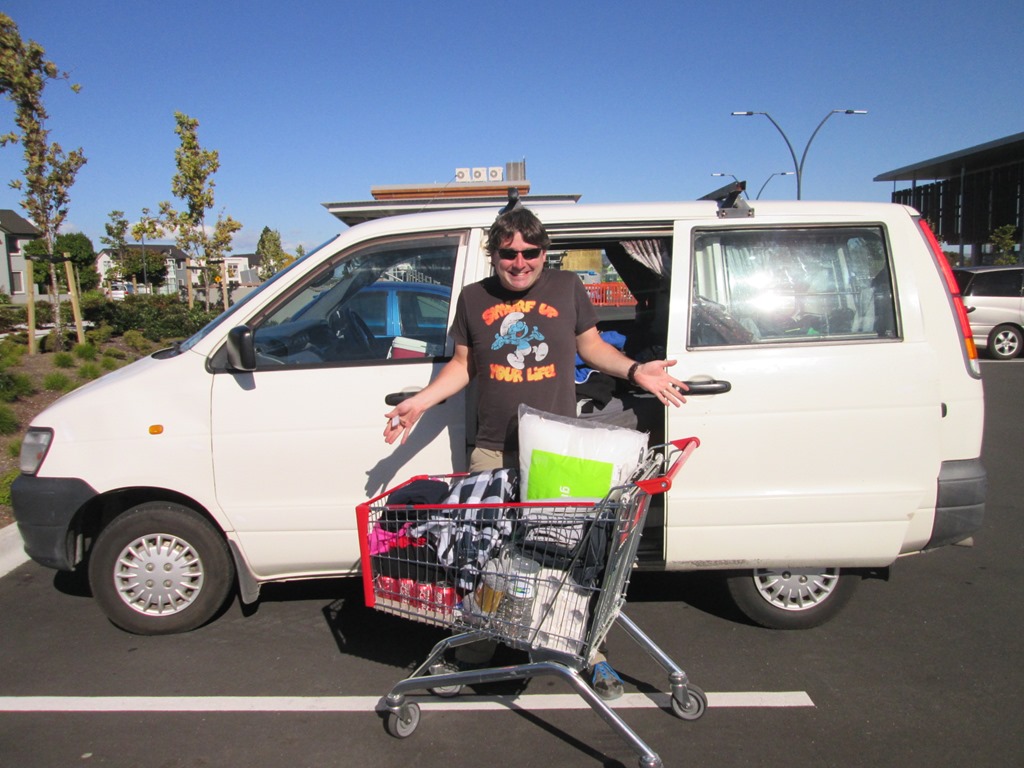 Erster Stopp: Einkaufen! Wir haben jetzt etwa 5 Monate lang nur ein langärmliges Kleidungsstück pro Person benötigt, damit ist jetzt wohl Schluss, denn hier ist ja Herbst. Wir kaufen für etwa 200 NZ$ Klamotten ein, darunter dicke Pullis und eine Mütze. Die werden wir bestimmt noch brauchen, in Queenstown auf der Südinsel ist es tagsüber wohl momentan 4 Grad. Oha. Hier im Norden ist es aber noch etwa 22 Grad war.