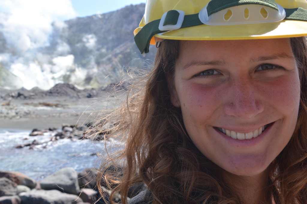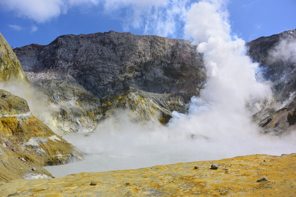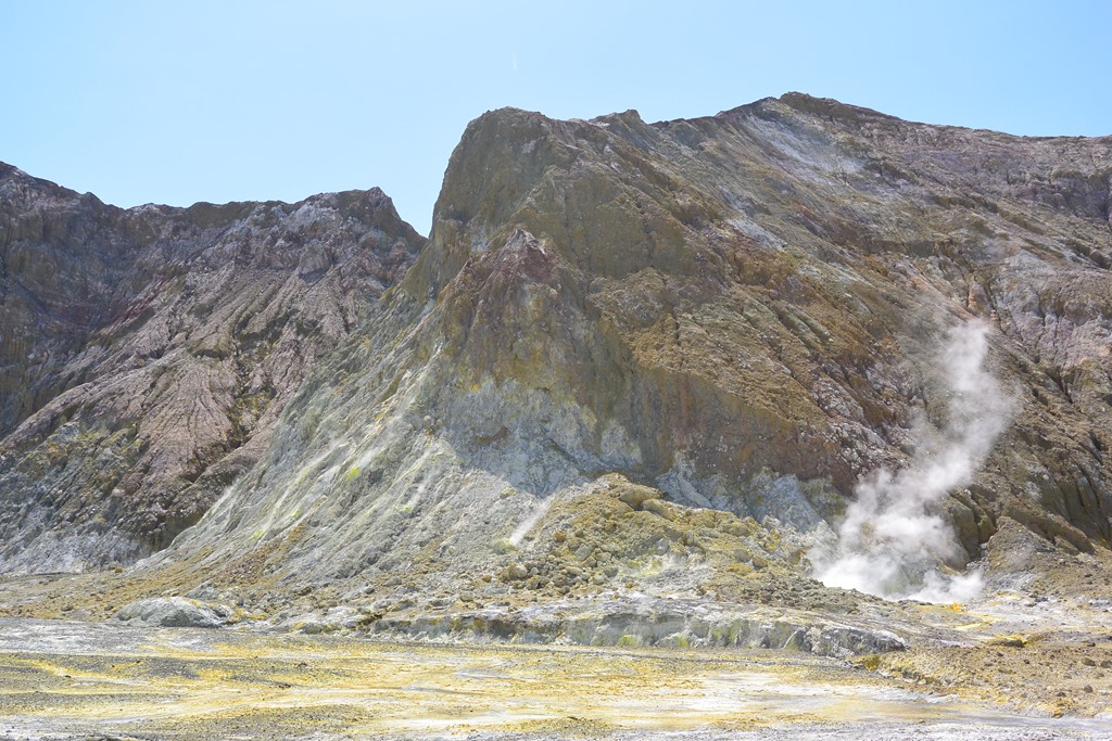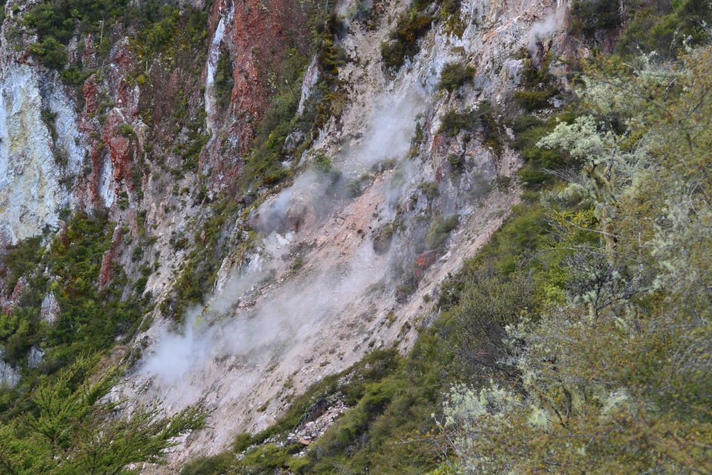 Auf der uns gegenüberliegenden Seite des Sees liegt der Haupt-Schlot des Vulkans. Dieser wird “Noisy Nelly” genannt und noisy (=laut) ist er wirklich. Zeitweise zischt er so laut, dass man etwas lauter reden muss, um verstanden zu werden.