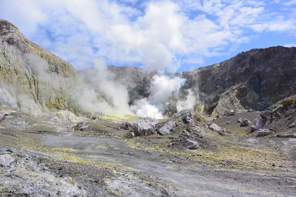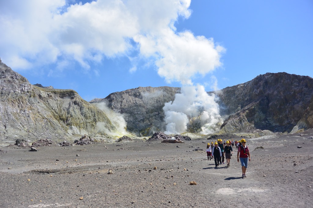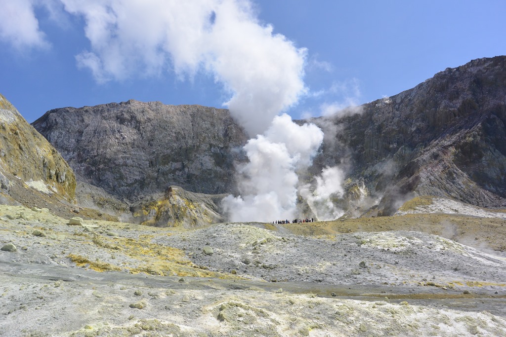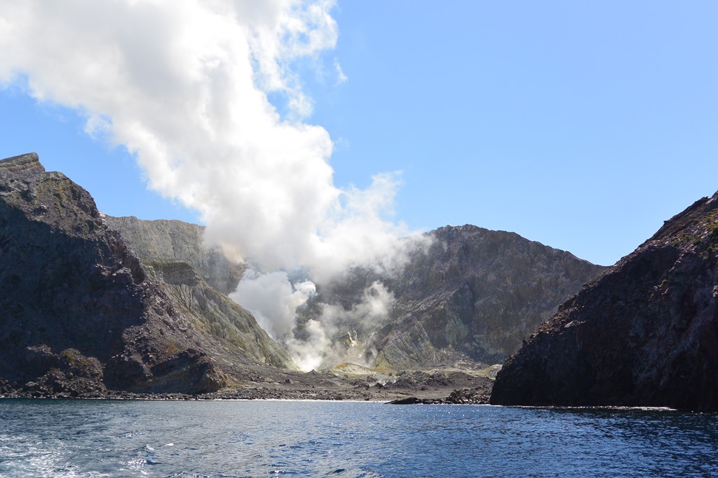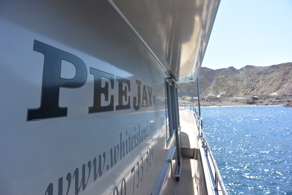 Dort angekommen, bekommen wir komische Metallringe in die Hand gedrückt. Das wäre unser “Ticket” sagte man uns. Hat auch so funktioniert und wurde beim Boarden des Bootes auch wieder eingesammelt. Was es denn genau war, wissen wir bis heute nicht. Das Boot fährt jedenfalls pünktlich los, diesmal auch mit uns an Bord und die vor sich hin-dampfende White Island kommt auch auf der 90 Minuten-Fahrt Stück für Stück näher.