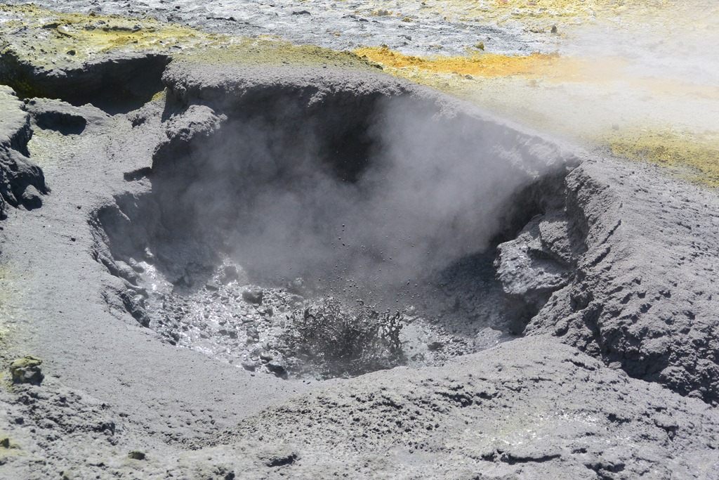 Geglaubt haben wir das auch sofort, denn der Vulkan ist voller kleiner Löcher in denen irgendwas blubbert und dampft. In den meisten Fällen ist das grauer Matsch, manchmal aber auch Wasser in allen möglichen Farben, zumeist irgendwie grünlich. Manche von diesen Löchern blubbern auch, obwohl sie garnicht kochen, das sind dann nur Gase die dadurch aufsteigen und dementsprechend Blasen werfen.