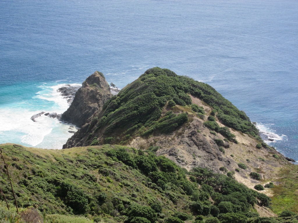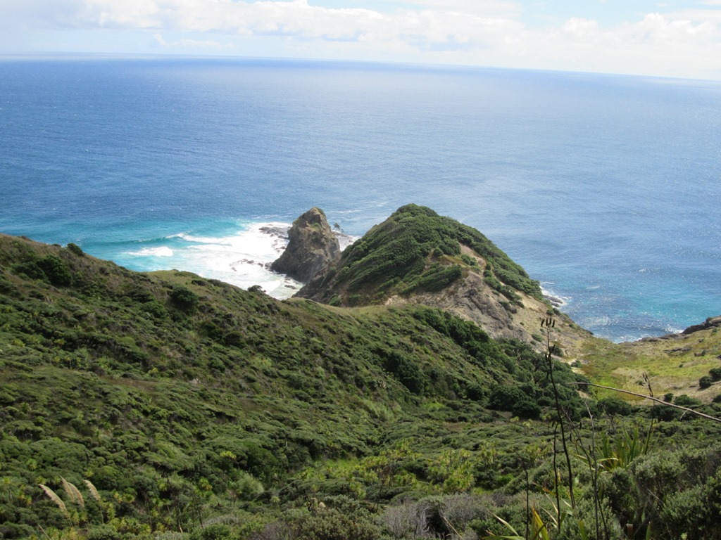 Ich hoffe, man kann den Bam auf dem nächsten Foto ein wenig erkennen. Er ist ziemlich genau in der Spalte zwischen der kleinen Stein-Insel ganz vorne und dem grünen Hügel, der bereits zum Festland gehört. Von dort schwimmen die Seelen dann übrigens weiter zu einer Insel im Norden. Viele Maori kommen hierhin, um sich von Angehörigen zu verabschieden, oder ein paar letzte Worte loszuwerden. Während wir dort waren, waren auch Maoris anwesend. Wir wurden gebeten, den Ort mit entsprechendem Respekt zu behandeln, an einigen Backpackern gehen solche Bitten irgendwie leider vorbei und so purzeln dutzende Mädels mit viel zu wenig Kleidung aus unserem Bus und hüpfen für ihre Fotos vor den Maori herum. Uncool.
