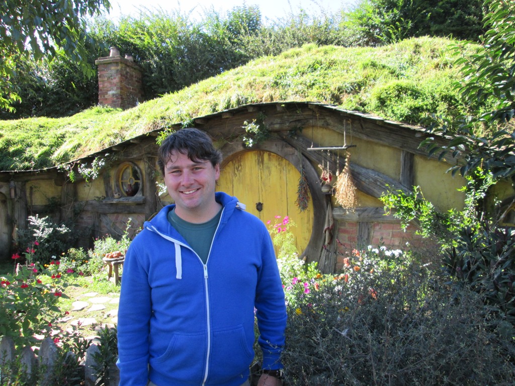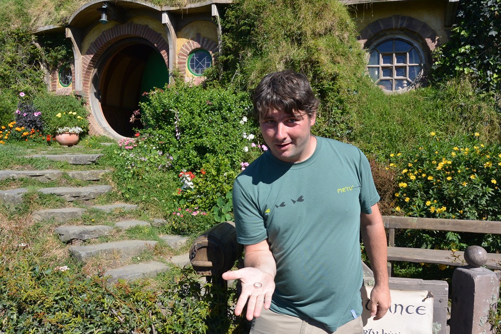 Unser Guide führt uns langsam den Hügel herauf und erklärt uns jede Menge Trivia, zum Beispiel (das ist dem süchtigen Fan natürlich bekannt) dass die Hobbithöhle unterschiedliche Maßstäbe haben, je nachdem, ob mit Hobbitdarstellern oder Menschen/Zaubererdarstellern gefilmt wurde: Die Hobbithöhlen sind menschengroß, die Höhlen, die mit “großen” Darstellern gefilmt wurden, kleiner.