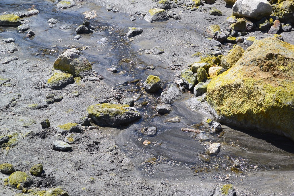 Auf dem Weg wieder weg vom Krater wird uns ein wenig über die vergangenen Ausbrüche des Vulkans erzählt. Der letzte ist wohl erst ein paar Jahr her, 2009 wenn ich mich recht erinnere. Spuren dieser vergangenen Ausbrüche kann man hier überall noch sehen, wie zum Beispiel riesige Steine, die durch die Gegend gespuckt wurden. Auf dem Rückweg kommen wir auch an zwei “Flüssen” vorbei, deren Wasser wir sogar testen dürfen.