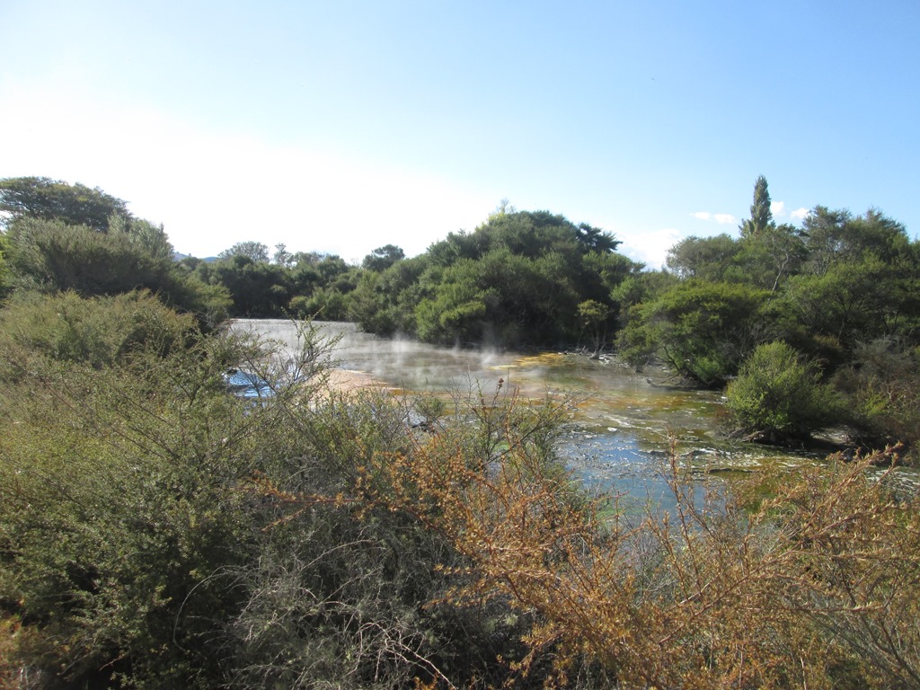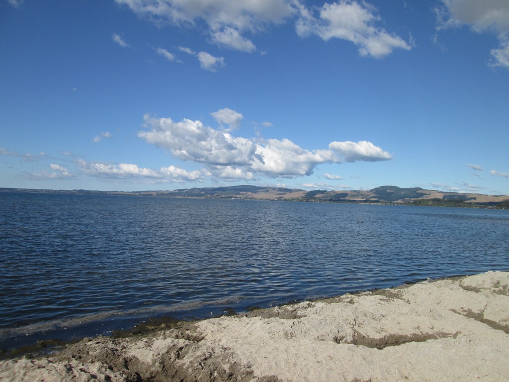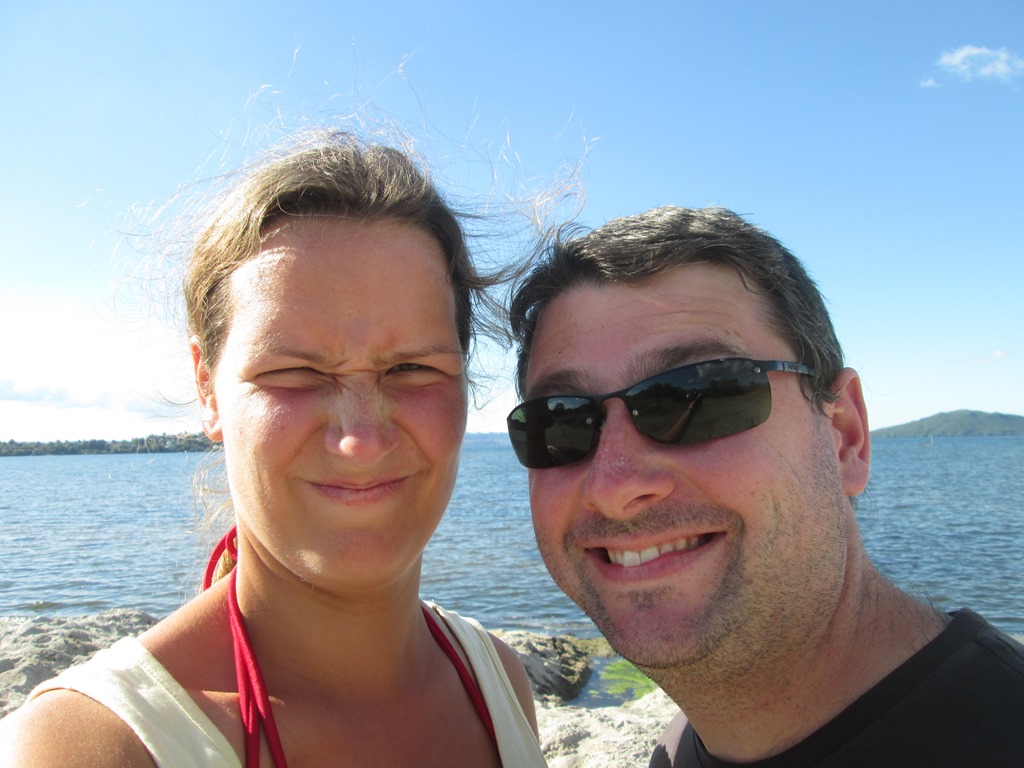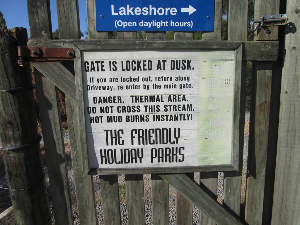 Der Park liegt direkt am See und bietet einen “Hot Beach”. Was ist denn ein Hot Beach?! Naja, der See wird wohl auch durch Erdwärme erhitzt und hat so ungefähr Badewannentemperatur. Hygienischer wird er dadurch aber nicht. Auch in die kleinen, blubbernden Pfützen am Strand wollen wir uns nicht so recht reinsetzen.