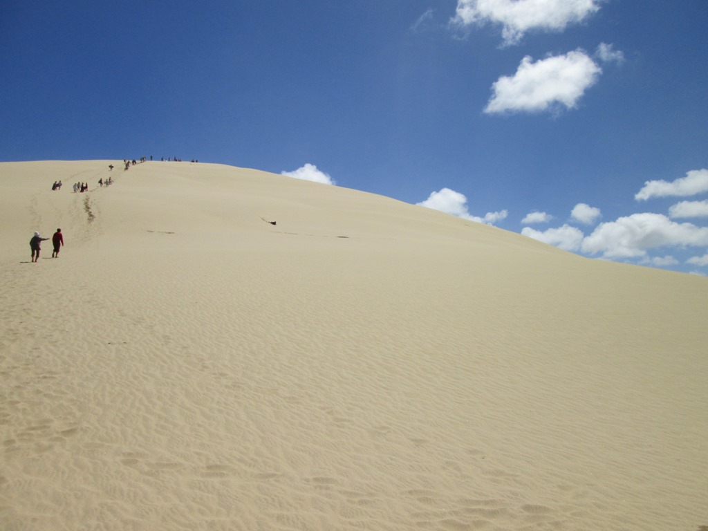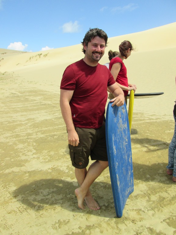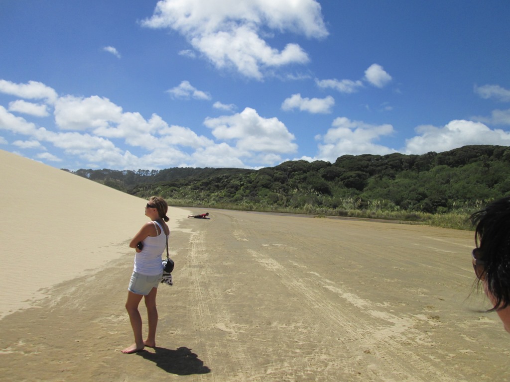 Wieder im Bus fahren wir dann in Richtung “Big Sanddunes” und “90 Mile Beach”. Die Dünen sind wohl zustandegekommen, als irgendwo ein großer Vulkan ausgebrochen ist, der einiges an Asche und Gestein ins Meer gespuckt hat. Dieser ganze Kram wurde dann vom Meer gewaschen und wieder angespühlt und plötzlich waren hier riesige Sanddühnen. An den Sanddunes steht dann Sandboarding auf dem Programm, das ist nichts anderes als ein kleines Schwimmbrett zu nehmen und sich damit die Dünen herunterzustürzen. Erkennt ihr mich auf dem rechten Bild?