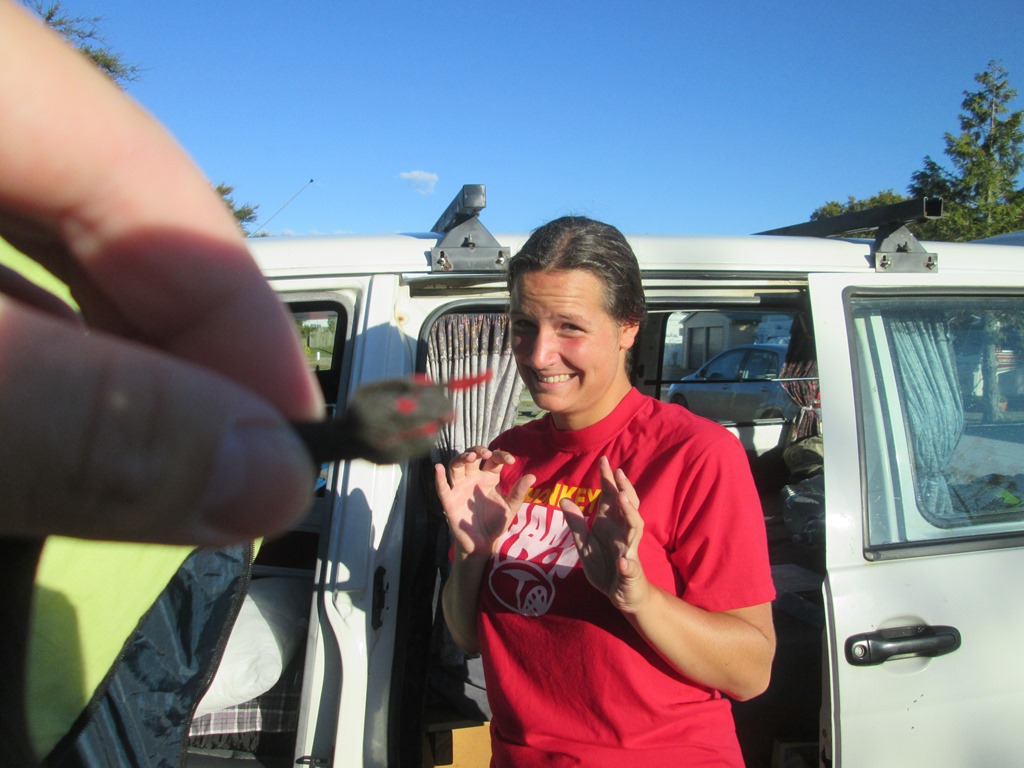 Bei der Gelegenheit kürzen wir noch meine Haare ein bisschen weiter, inzwischen auf 5mm. Endlich haben wir auch ein bisschen Zeit, den Camper aufzuräumen und finden von den Vorbesitzern eine kleine Gummischlange. Was die damit gemacht haben, möchte ich vielleicht garnicht wissen.
