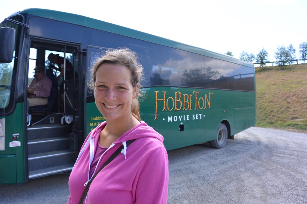 Alle anderen brauchen vielleicht garnicht weiterzulesen, weil es sie nicht interessieren wird , denn heute geht es zu einem der absoluten Reisehöhenpunkten, auf die wir uns seit wir die Reise planen, gefreut haben, heute geht es nach….Trommelwirbel….HOBBINGEN! Das Filmset wurde zwar nach dem Herrn der Ringe mehr oder weniger abgebaut, aber für den Hobbit wiederaufgebaut (und erweitert) und diesmal bleibt es für Filmfans wie uns, die sich das ganze gerne angucken wollen. Juchu! Also ab in den Tourbus und los geht’s, ins Auenland, was sich versteckt zwischen Hügeln einer örtlichen Schaffarm befindet. Wir bekommen auf dem Weg schon Angst: das Umland ist total ausgedörrt, weil es wenig geregnet hat, wird das Auenland so grün sein, wie in den Filmen?