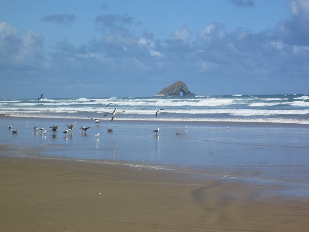 Leider ist die Nacht mal wieder viel zu kurz, im Camper wird man so ziemlich mit Sonnenaufgang wach, das ist hier so um 7 Uhr. Ein kurzes Frühstück und dann geht es nach Whakatane, das ist hier die nächste Ortschaft. Von dort kann man Tagesausflüge auf die “White Island” unternehmen. Das ist Neuseelands einziger aktiver Meeresvulkan. Das dorthin tuckernde Schiff sehen wir gerade noch den Hafen verlassen. Verdammt. Nächste Fahrt erst morgen. Na gut, dann bleiben wir hier halt noch eine Nacht irgendwo. Zum Beispiel in Ohope. Das ist hier wohl das schönste Stück Land mit etwa 11km Strand. Wir steuern heute mal einen Bezahl-Campingplatz an, um uns eine Lage direkt am Strand zu sichern.