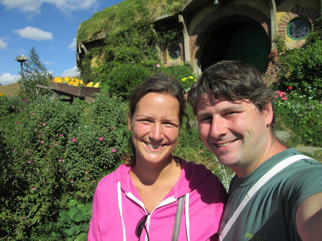 Überall um uns herum sehen wir Hobbithöhlen soweit das Auge reicht; auch der kleine Garten, komplett bepflanzt mit echtem Gemüse und die Hobbithöhlen liebevoll bepflanzt: bestimmt so, als ob ein Hobbit in jedem dieser Löcher wohnen würde. Wir sind begeistert. Und glücklich.