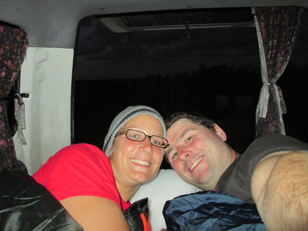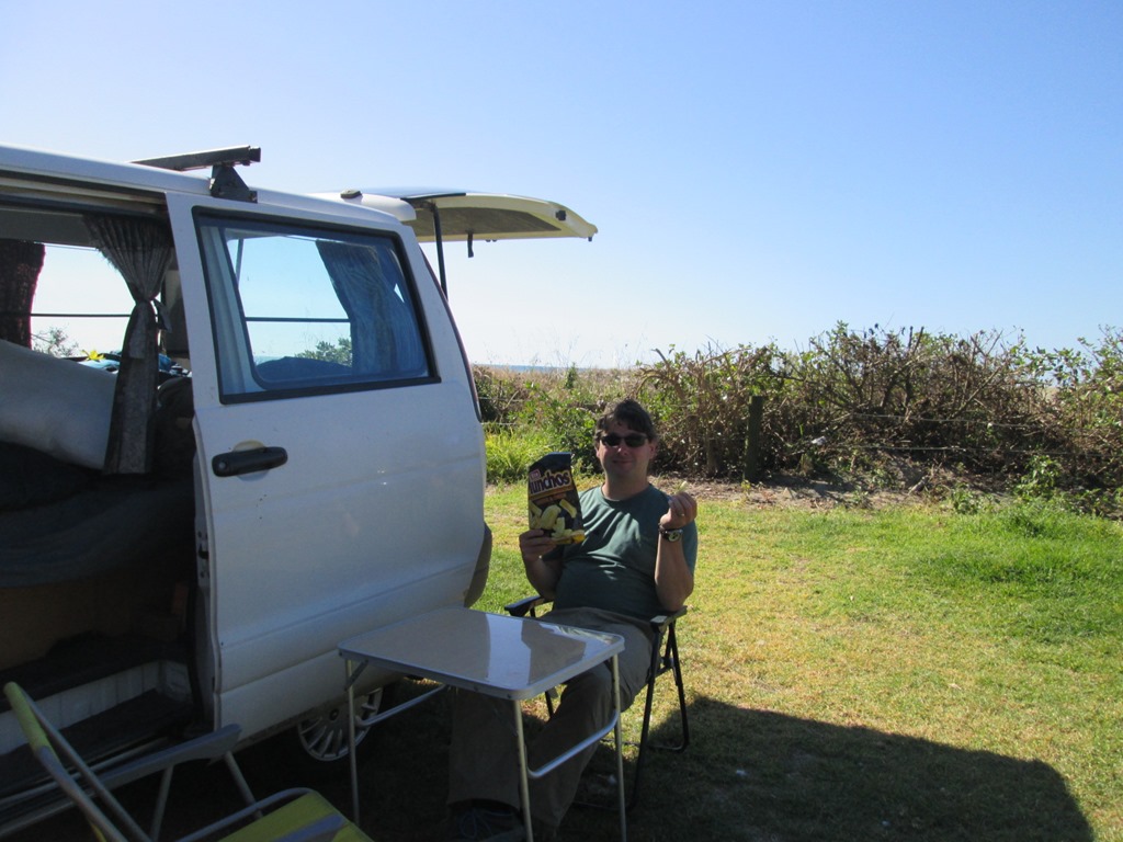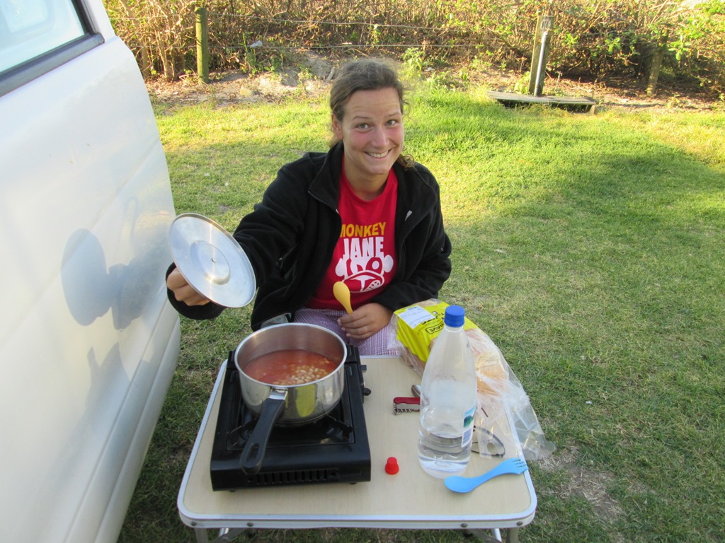 Anschließend gibt es bei uns noch ein Abendmal, welches wir auf unserem superpraktischen Campingkocher zubereiten. Es gibt: Baked Beans. Mit Brot. Wir sind eben Sterneköche. Gutgesättigt schwingen wir uns nach Sonnenuntergang auf unsere Matratze. Denn draußen wird es kalt, sobald die Sonne weg ist. Wir mummeln uns in unsere Schlafsäcke (Conny sogar mit Mütze) und machen die Heckklappe auf, denn von dort hören wir noch die Wellen und sehen ein bisschen vom Meer.