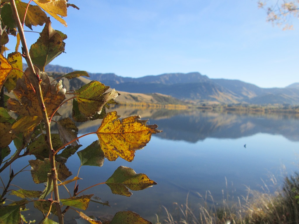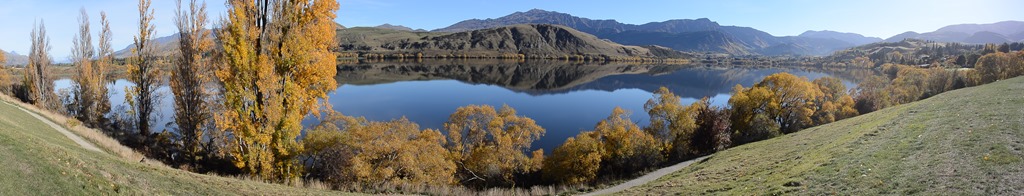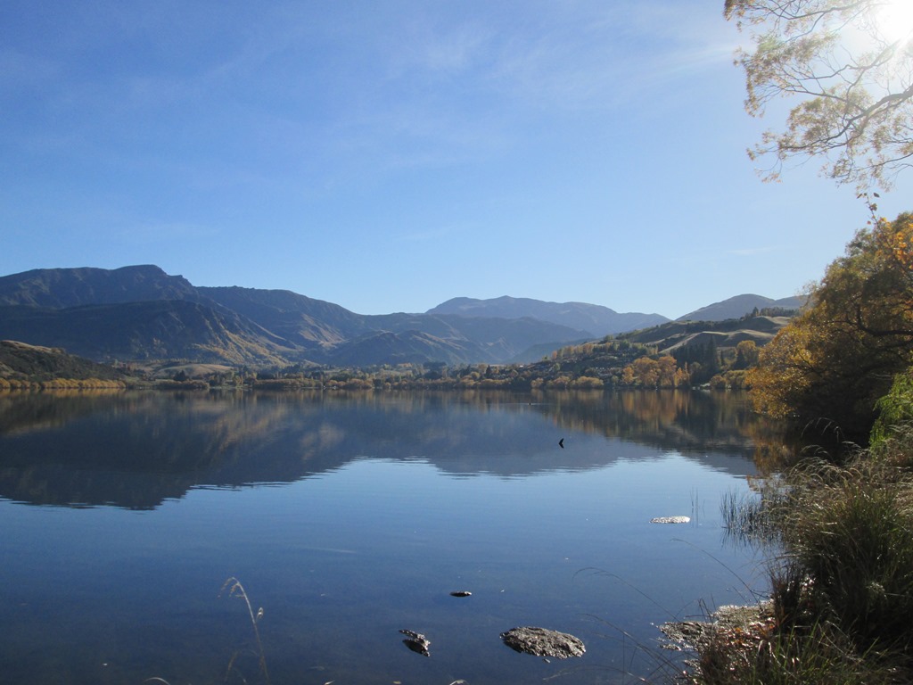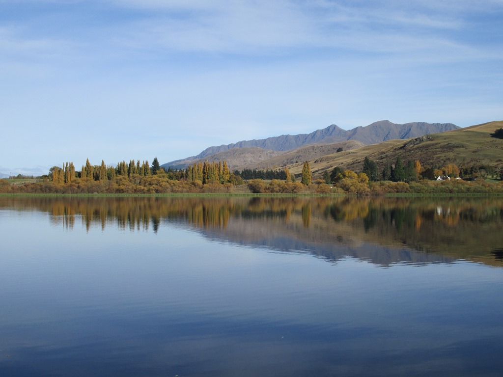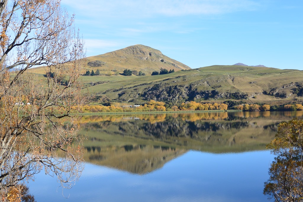 Wir sind hier zwar schon einmal in die grobe Richtung gefahren, als wir bei Mount Cook waren, aber letztes mal hatten wir entweder schlechtes Wetter oder es war dunkel. Tagsüber sieht man die Dinge deutlich besser, zum Beispiel einen kleinen See kurz hinter Queenstown in dem sich die umgebenden Hügel gespiegelt haben. Der hat es uns ganz besonders angetan!