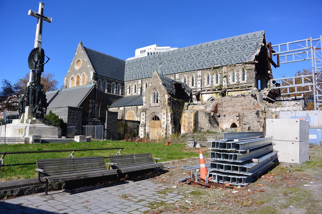 Nach wenigen Schritten kommen wir zum Cathedral Square, dem Wahrzeichen des Erdbebens, wenn man so will. Hier stehen nämlich die Überreste der Kathedrale von Christchurch, die großen Schaden erlitten hat. Sie hat früher wohl auch mal einen recht hohen Kirchenturm gehabt, den gibt es aber nicht mehr.