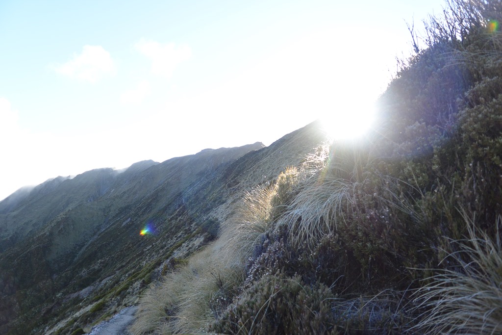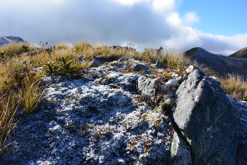 Es ist tatsächlich sehr kalt hier oben am Morgen. Die weiße Färbung der Gipfel kommt ja auch nicht von ungefähr, hier hat es nachts ein wenig geschneit und ein wenig mehr gefroren. Auch die Gräser und Büsche, die hier noch wachsen sind alle vereist.