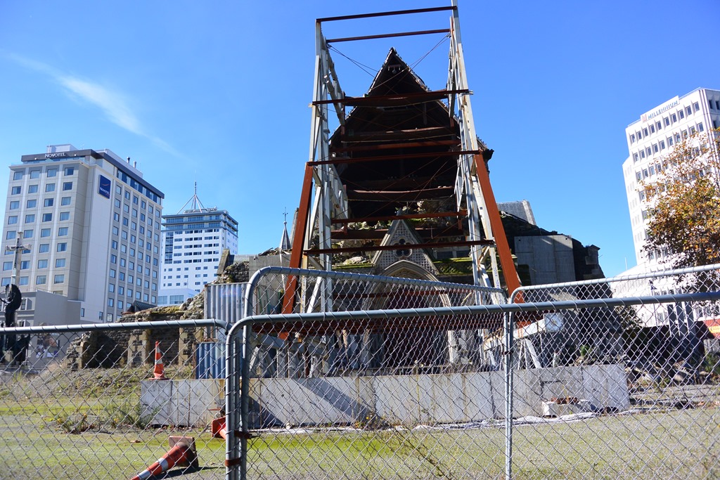 Die Metallstrukturen auf der rechten Seite wurden nach dem ersten Erdbeben installiert, um die Kirche vor der Zerstörung zu bewahren, das zweite Erdbeben war aber so viel heftiger als antizipiert, so dass die Stahlstrukturen den Einsturz des Turmes wohl eher begünstigt haben.