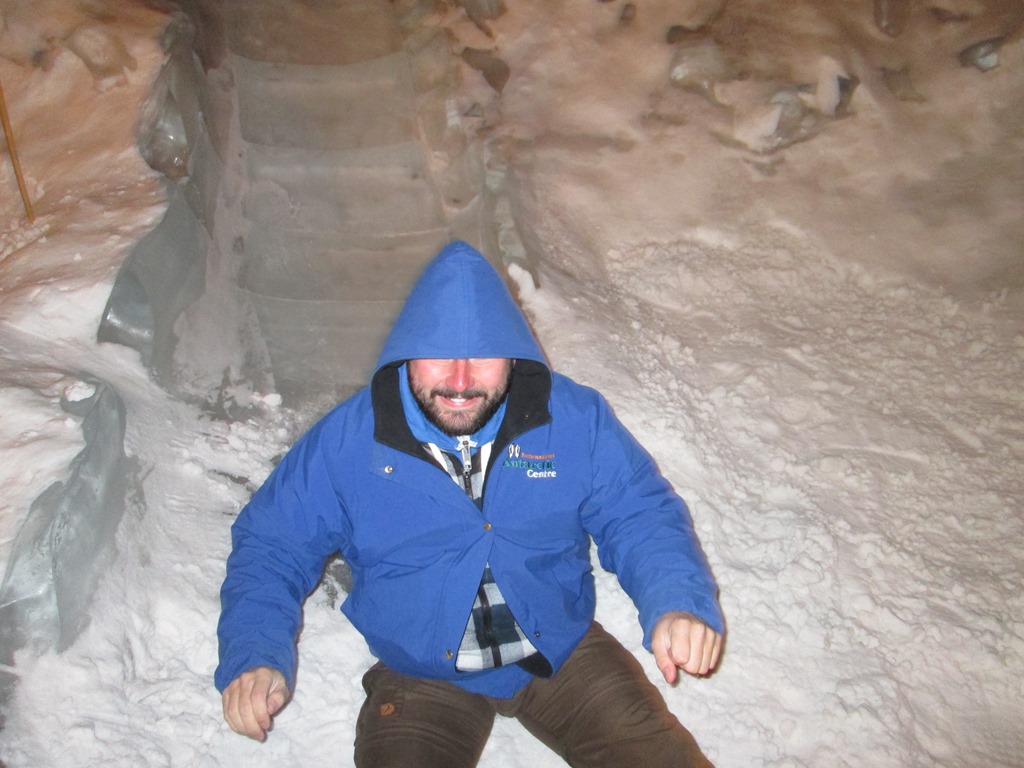 Außerdem gab es in dem Raum eine Eisrutsche und wir hatten hinterher nasse Hintern. Verdammt. Hier lernen wir außerdem Mick kennen, der arbeitet hier und weiß dass “penguin” auf deutsch “Pinguin” heißt. Cooler Typ. Er schickt uns dann auch direkt zur nächsten Aktivität, für die wir ja direkt gemeldet waren: Höglund fahren. Höglund ist ein schwedisches Geländemobil, mit dem in der Antarktis herumgekurvt wird.