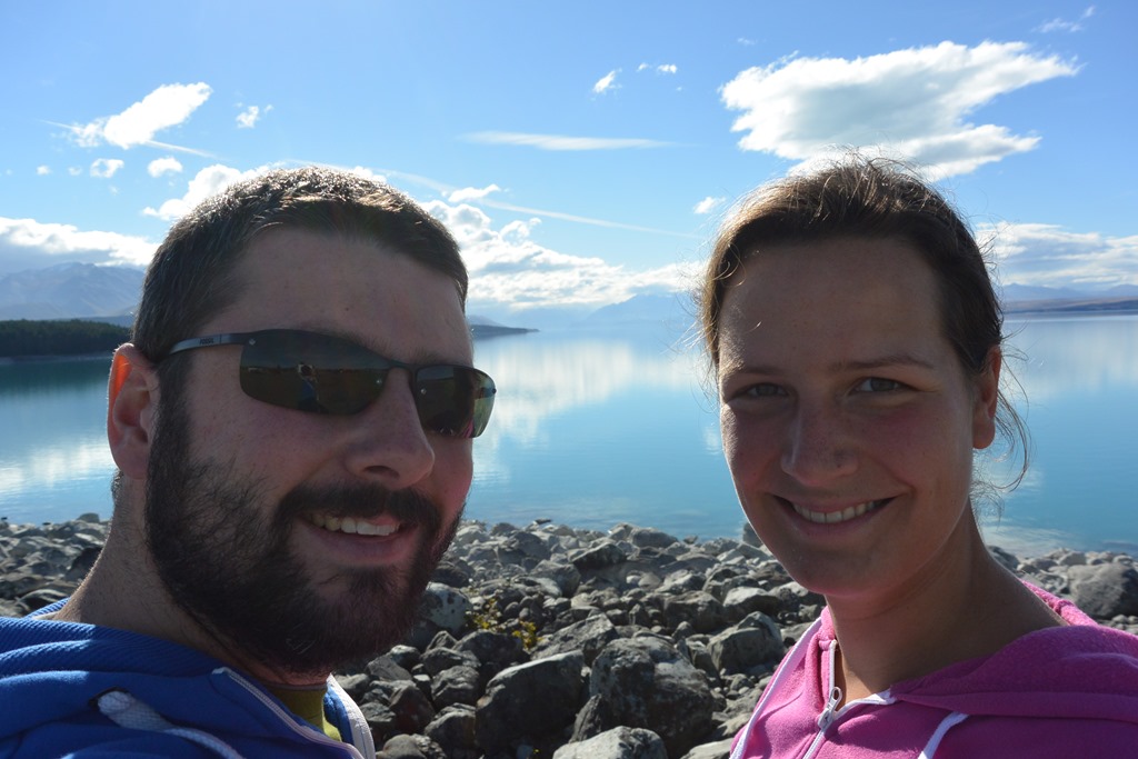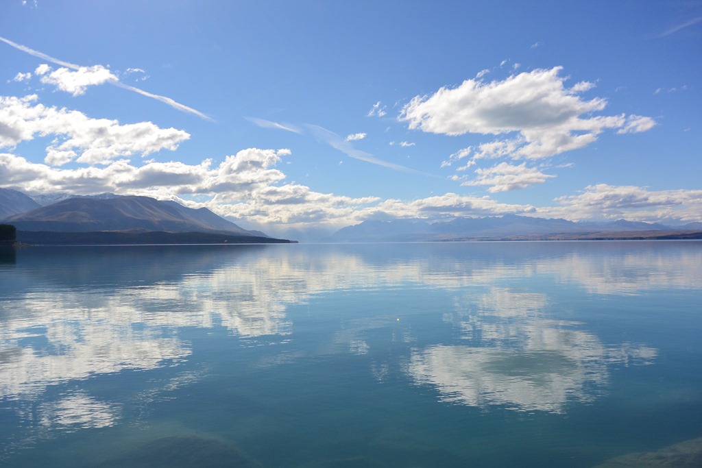 Der See war total ruhig und klar, man konnte sogar bis auf den Grund schauen. Die Wölkchen am hier noch schönen blauen Himmel reflektieren sich pittoresk im Wasser, so haben wir uns Neuseeland vorgestellt!