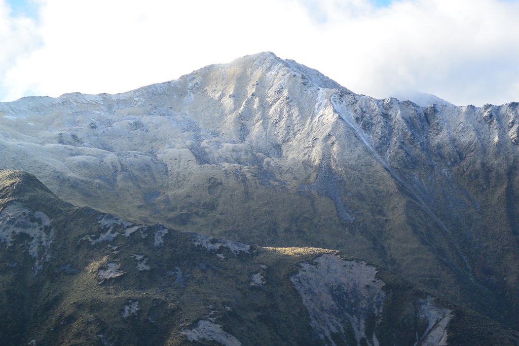 Ich erreiche kurze Zeit später den ersten Sattel und stelle erst einmal fest, dass die Berge nur von einer Seite zugeschneit sind, nämlich von meiner rechten Seite. Links ist der Hang völlig frei, da wissen wir ja von wo der Wind letzte Nacht kam. Das sind glaube ich wieder diese Winde aus der Antarktis, die wir letztes mal schon hatten.
