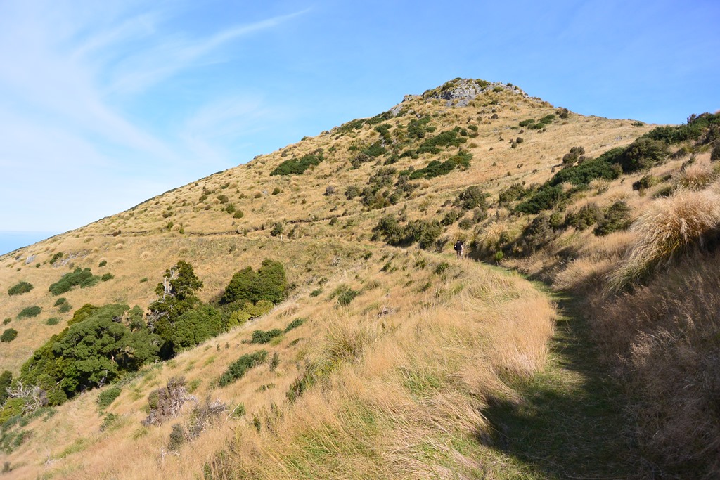 Oben auf der Bergkuppe sieht man in der Ferne schon den ersten Shelter, das wäre dann in etwa 1/4 der heutigen Strecke, eher etwas weniger.