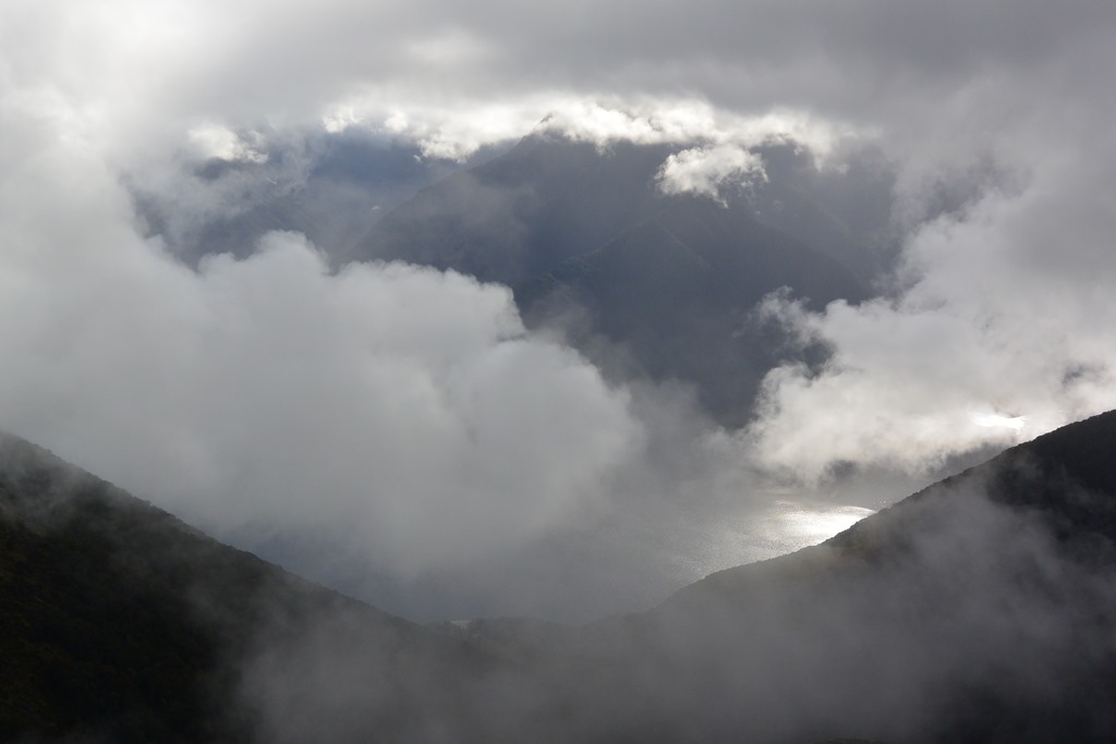 So komme ich wieder nur in Teilen zu den heißersehnten Bergpanoramen auf die Kepler Mountains, denn die hängen nun natürlich alle wieder in den Wolken. Auch mein unechter Fjord versteckt sich größtenteils in weißer Zuckerwatte, schimmert allerdings immer mal wieder in schönstem Blau durch die Wolkendecke!