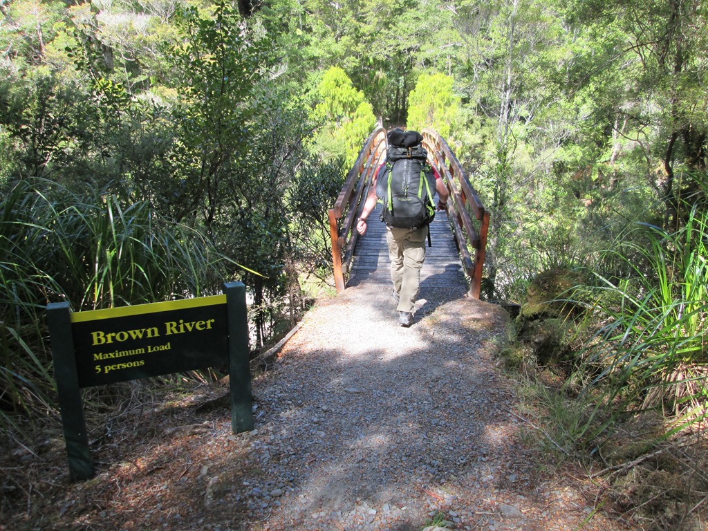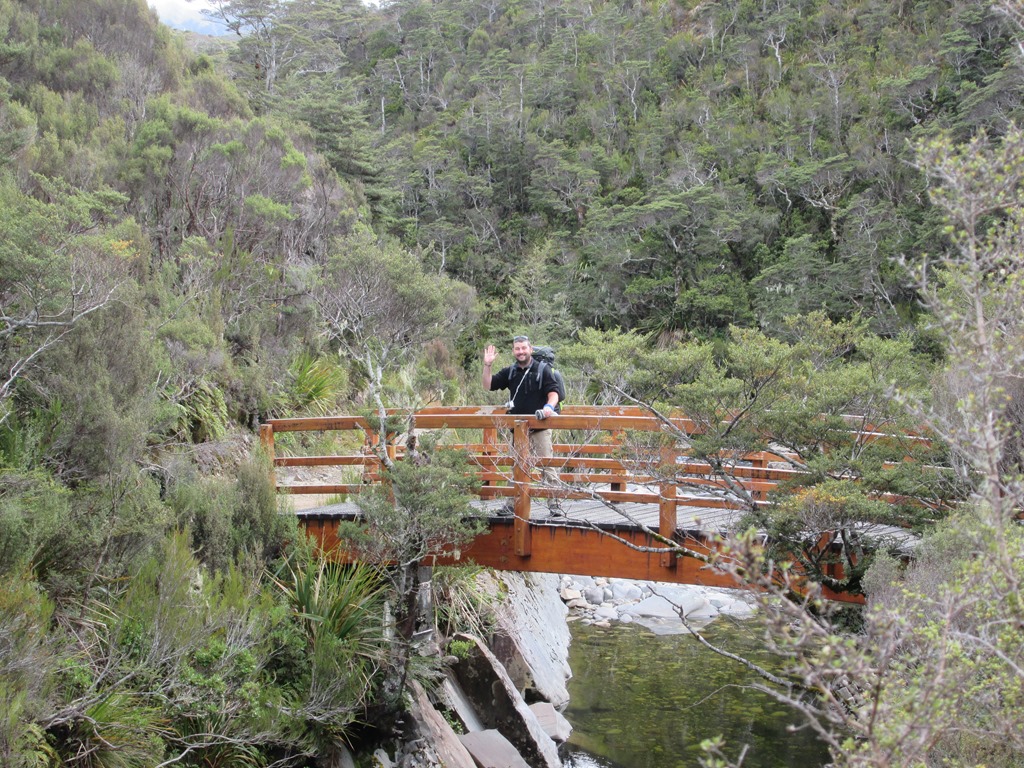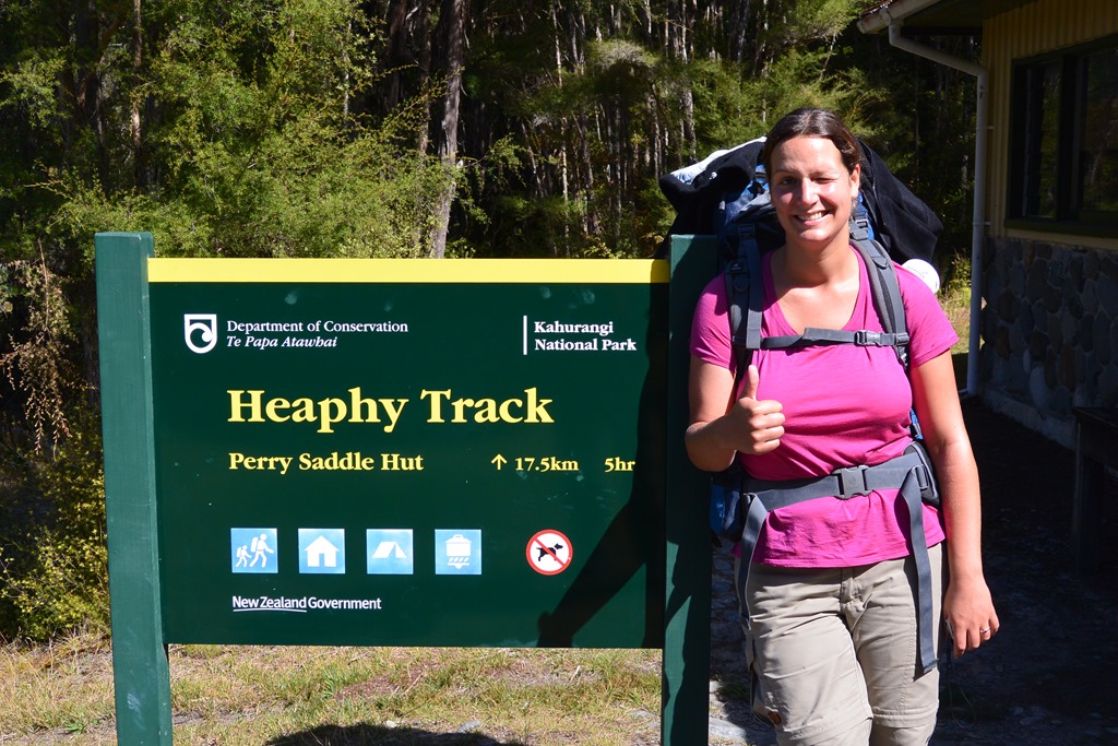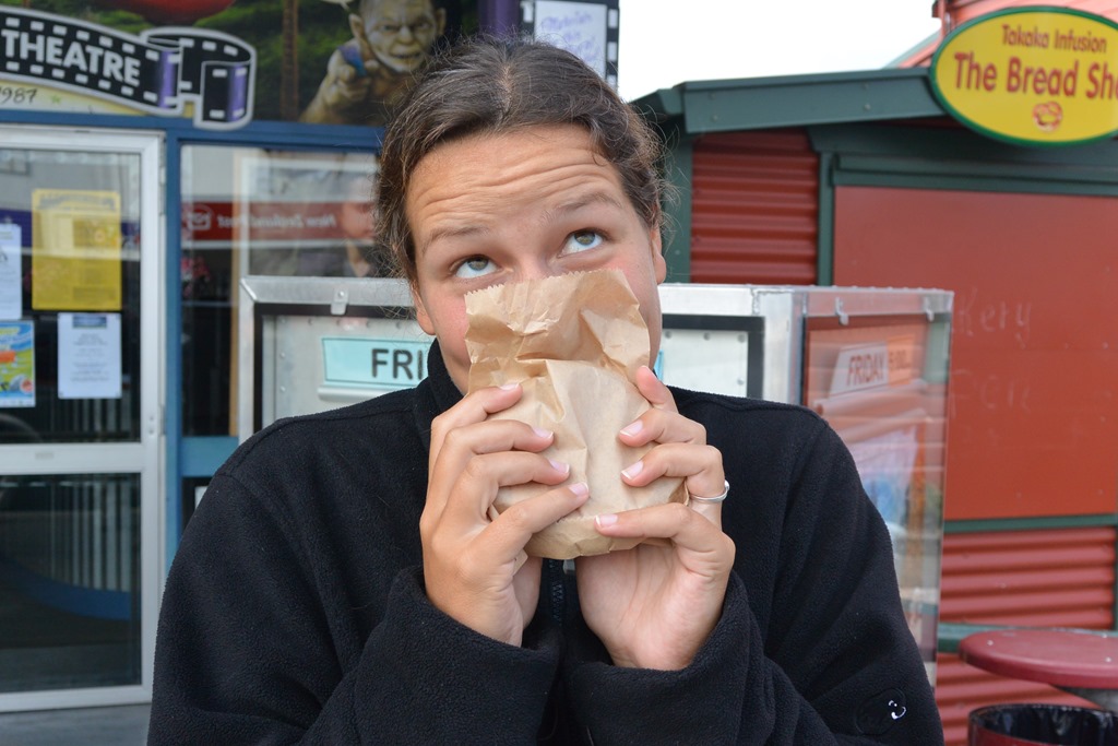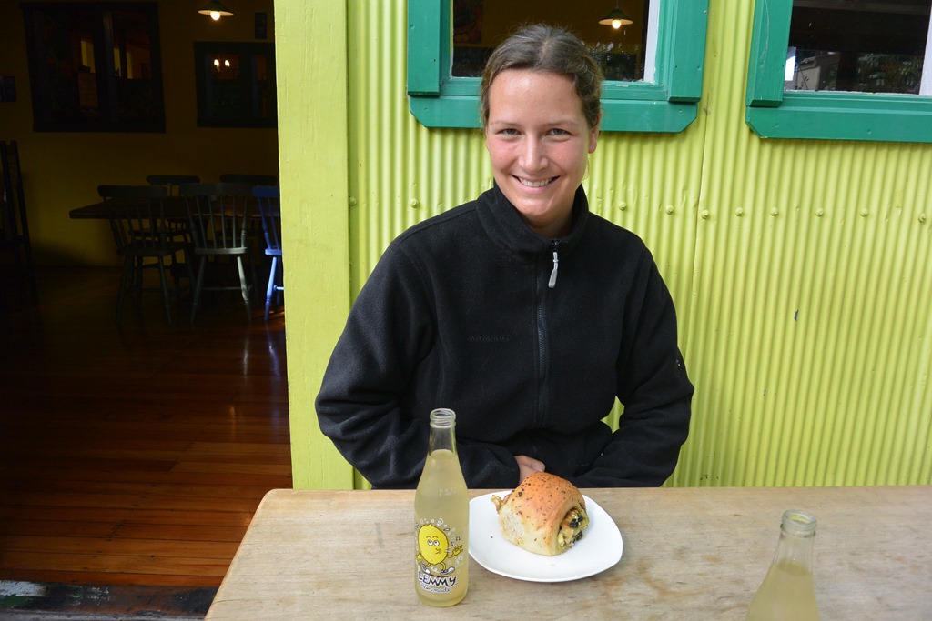 Am nächsten Morgen um 8 bringt uns ein Shuttle wie geplant zum Start des Heaphy-Tracks. Unser Fahrer scheint alkoholischen Getränken nicht abgeneigt, ist aber ganz nett drauf. Den Start des Tracks erreichen wir erst um 13:30 Uhr und davor machen wir auch noch eine Mittagspause in einem der bekanntesten Bistros Neuseelands, dem “Cafe Wholemeal” in Takaka. Können wir empfehlen. In Takaka kauft sich Conny bei einem deutschen Bäcker dann auch eine original Laugenbrezen, sowas vermissen wir ja schon!