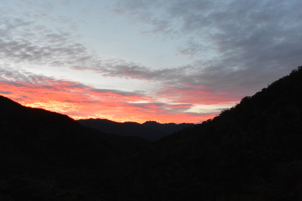 Wir wachen etwa um halb sieben relativ erholt in unserer Hütte auf. Schnell angezogen und einen Happen gefrühstückt, dabei konnten wir einen tollen Sonnenaufgang beobachten. Unsere Füße weisen von dem Gehetze gestern tatsächlich einige Druckstellen auf. Oder vielmehr von unseren neuen, nicht eingelaufenen Wanderschuhen, die wir uns gegen umgeknickte Knöchel zugelegt haben.