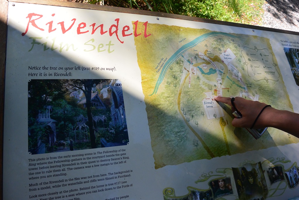 Danach ging es nach Bruchtal, was etwas nördlich von Upper Hut liegt in einem nahegelegenen Nationalpark. Vom Parkplatz aus gut ausgeschildert geht es auf eine kleine Lichtung, auf der einige Plakate zeigen, wo was gedreht wurde, denn hier stehen leider keine Kulissen mehr. Die Plakate sind auch bitter nötig und selbst mit ihnen braucht man viel Fantasie. Die Dreharbeiten sind nun auch schon 15 Jahre her und die Natur wächst. zudem sind die Wasserfälle, –man ahnt es schon-, hinterher hineinmontiert worden.