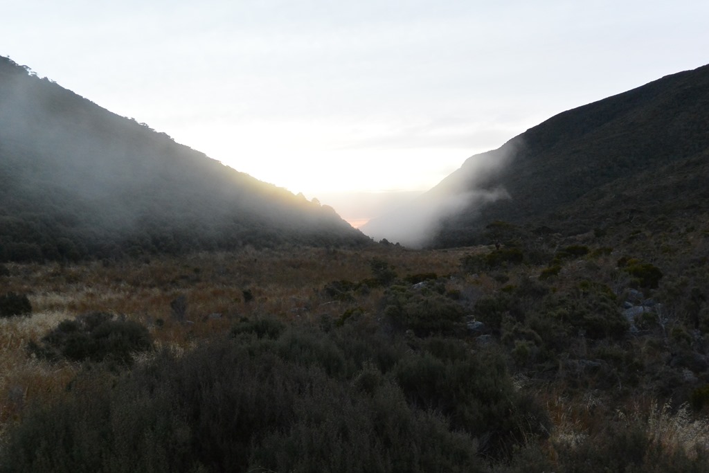 Bald aber wird die Pflanzenwelt niedriger und vor uns tun sich die Gouland Downs auf, eine 800m hochgelegene Steppenlandschaft. Im Morgenlicht und mit einigen tiefhängenden Wolken in den umgebenden Bergen ein toller Anblick!
