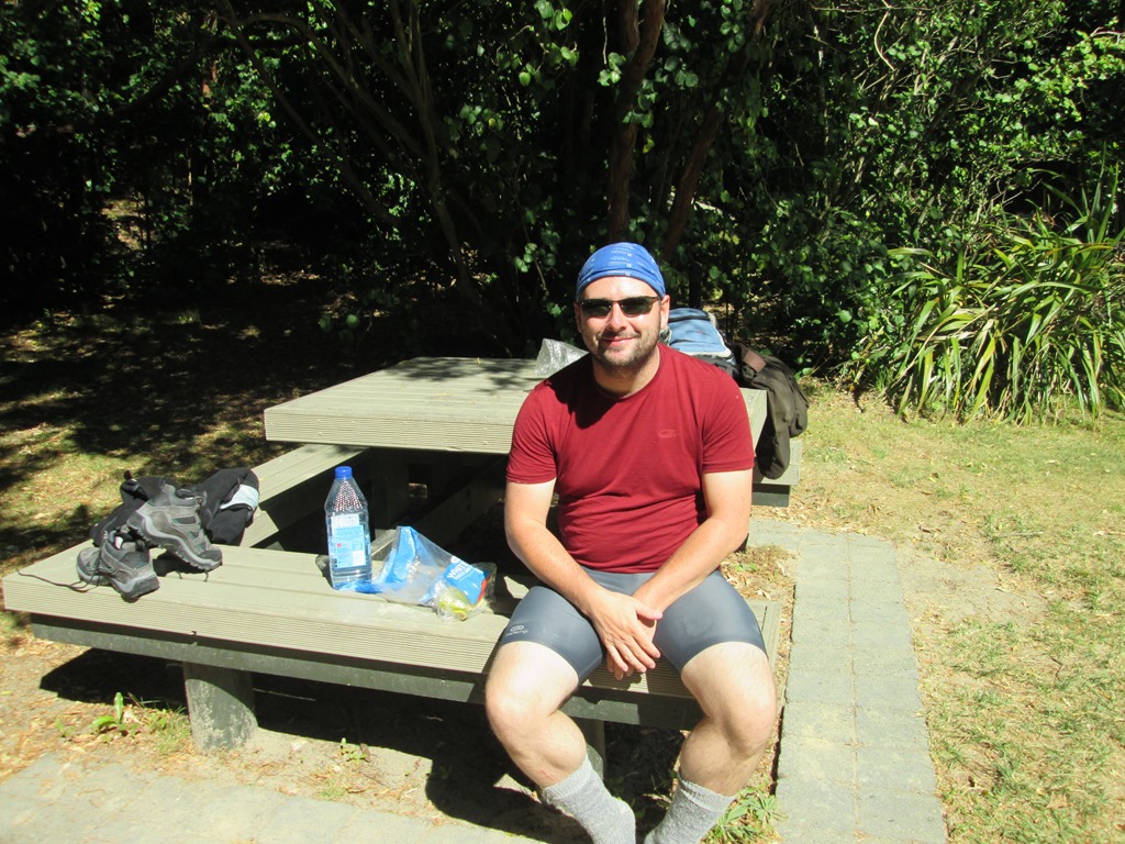 Bald darauf entdecken wir einen toll gelegenen Picknicktisch mit grandioser Aussicht und es heißt erstmal hobbitgetreu: Zweites Frühstück. Dabei beobachten wir unsere Hüttengefährten, die uns alle überholen. Das ist uns ganz recht, denn wir wollen uns nicht stressen lassen.