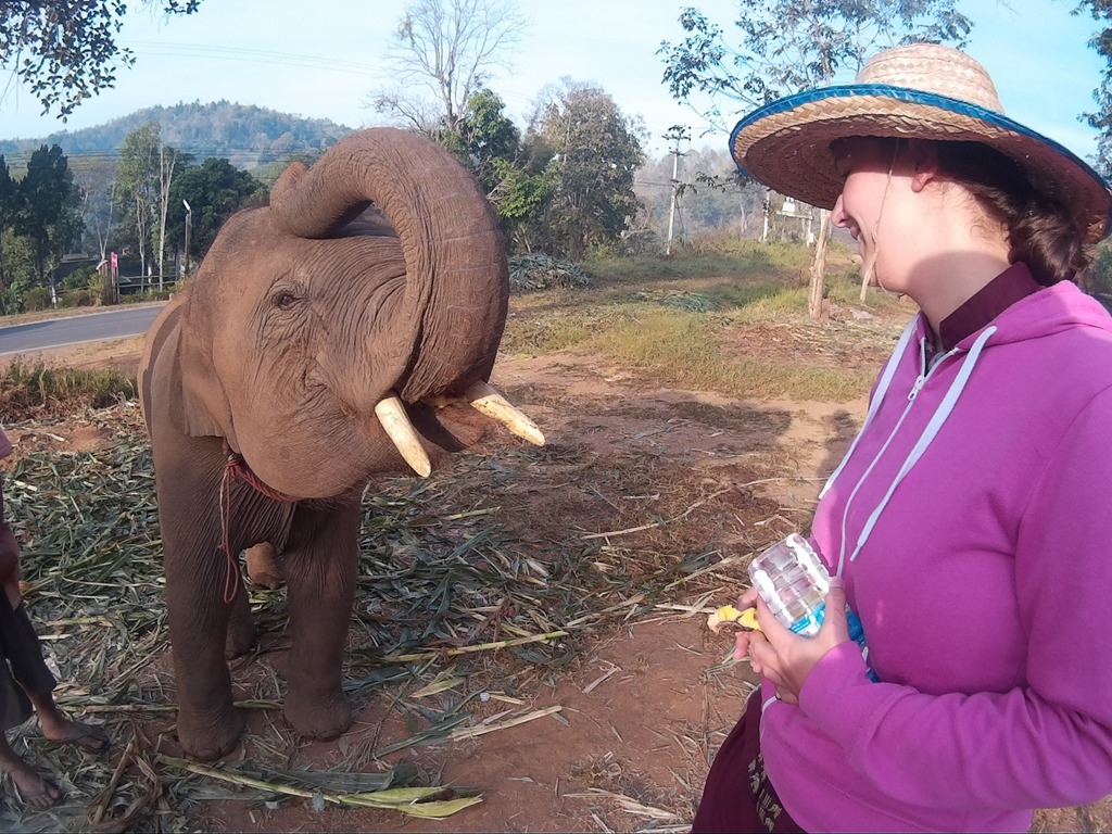 Es stellt sich heraus, dass der Elefant mit dem wir den Tag verbringen noch ein Baby ist und dass so ein Elefant unglaublich viel Essen muss am Tag – auch als Baby. Besonders beliebt sind Bananen, die wir dem Kleinen auch selber verfüttern dürfen. Aber nicht zu viele, denn nur Bananen ist nicht gut.