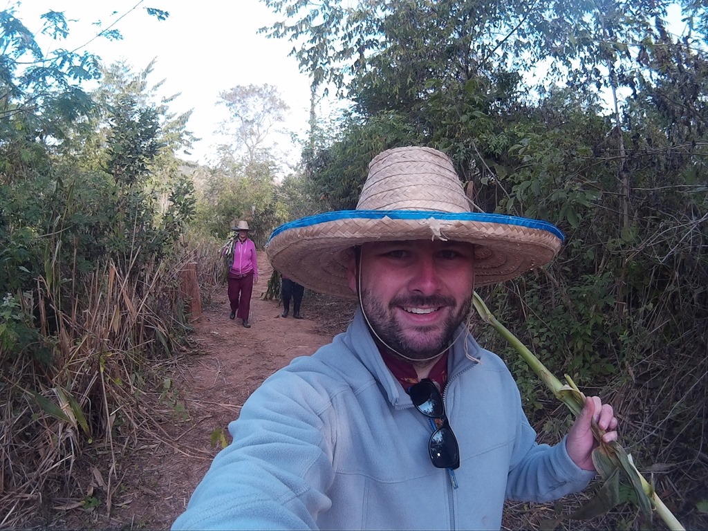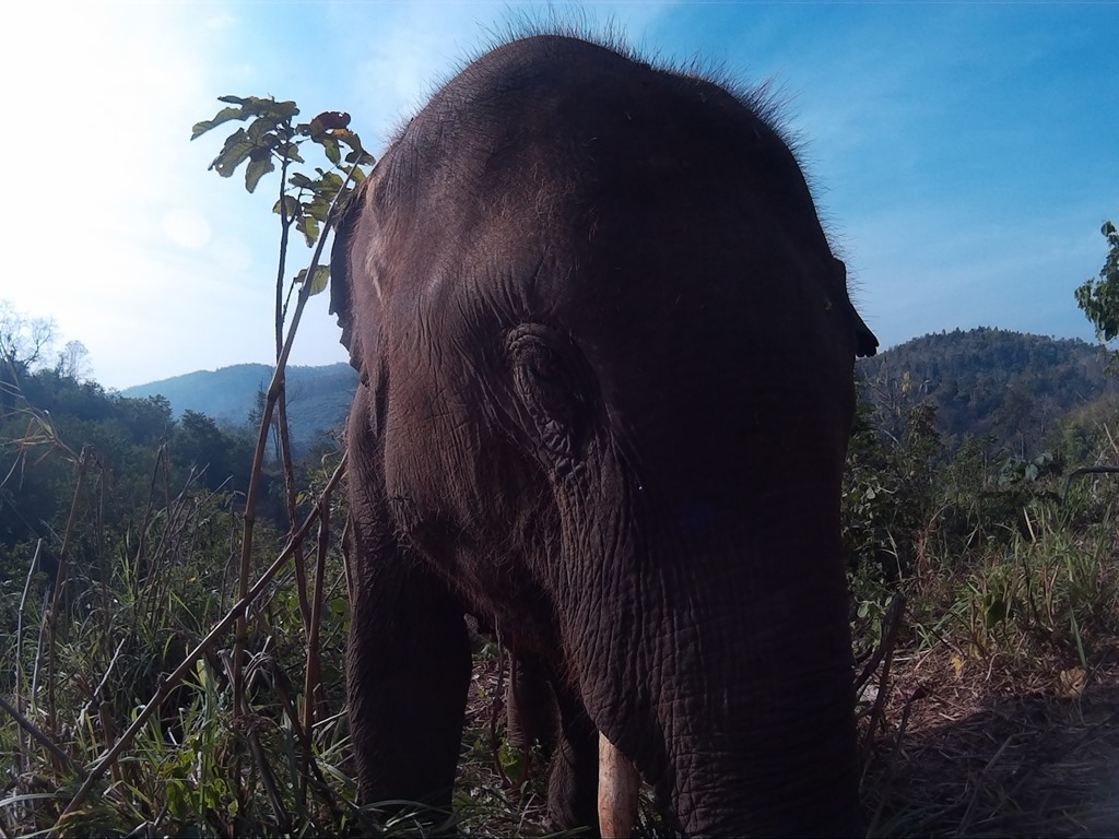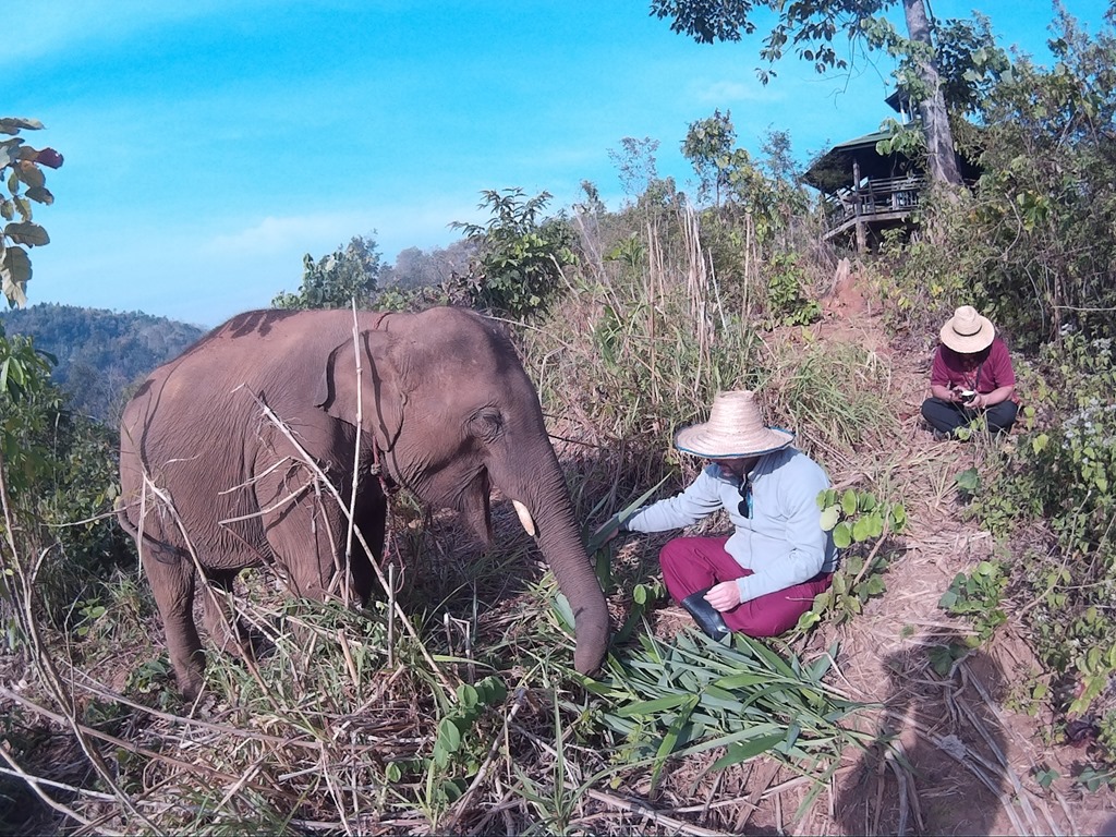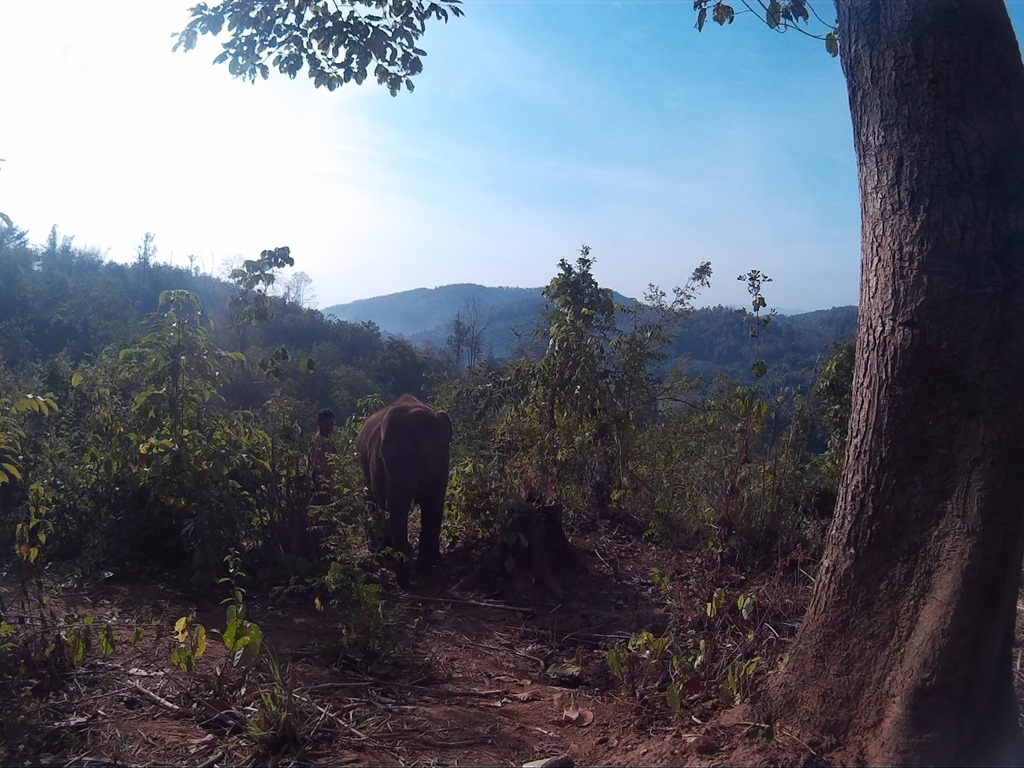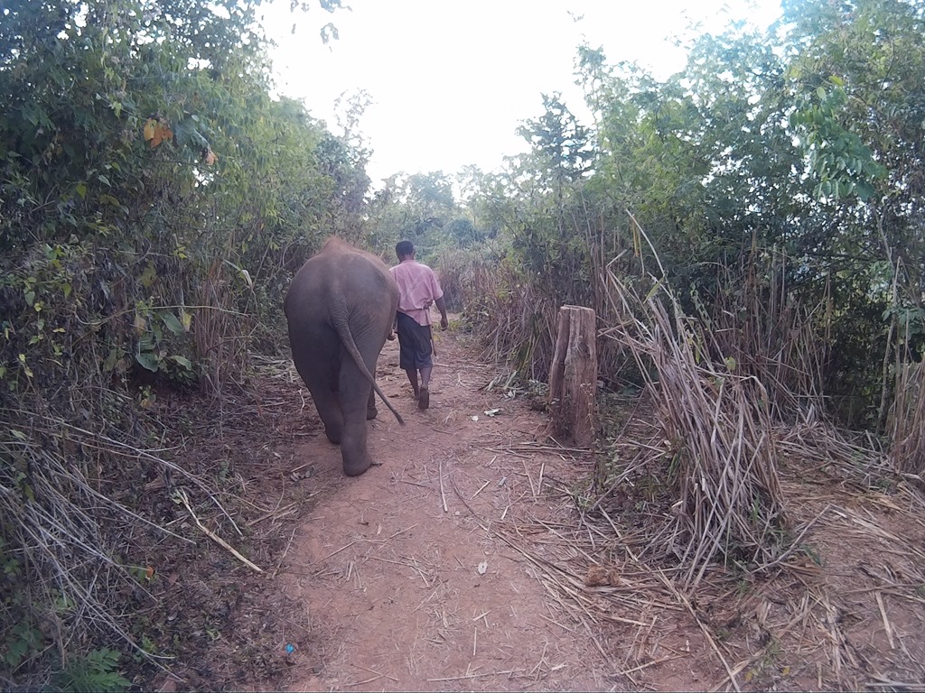 Ganz oben auf dem Berg meint unser Guide, wir sollten doch ein Foto mit dem Elefanten machen. Dafür lotsen sie den Elefanten an unsere Seite, der Elefantenführer hält ihn kurz fest und es macht klick. Im Nachhinein fanden wir das nicht ganz so tuffig. Wir interagieren sehr gerne mit dem Tier und beobachten es auch gerne beim Futtern, es festzuhalten für ein Foto hätte nicht sein müssen. Das haben wir irgendwie nicht so schnell begriffen, direkt in dem Moment als unser Guide zu einer ganzen Fotostory ansetzen wollte, jedoch interveniert und erklärt, dass wir dem Tier lieber hinterherlaufen.